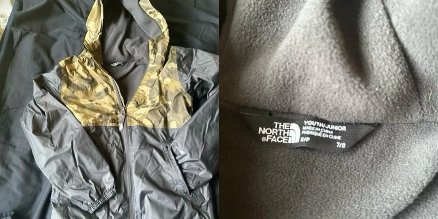 Selling a The North Face Youth/Junior rain jacket in size S/P (7/8). It features a stylish camo pattern on the upper part and a sleek gray color on the lower part. Perfect for keeping your little one dry and comfortable on rainy days!