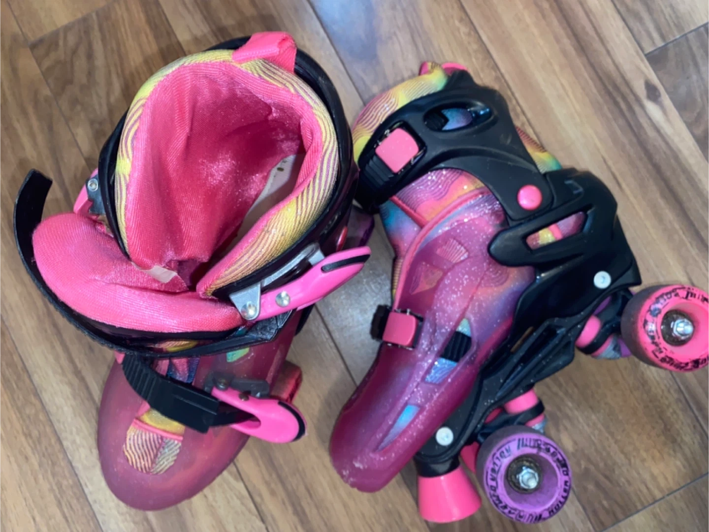 Selling a pair of Roller Derby girl's roller skates adjustable in size 3-6. They are pink and black and have some really cool details. Perfect for learning to skate or just having fun at the rink!