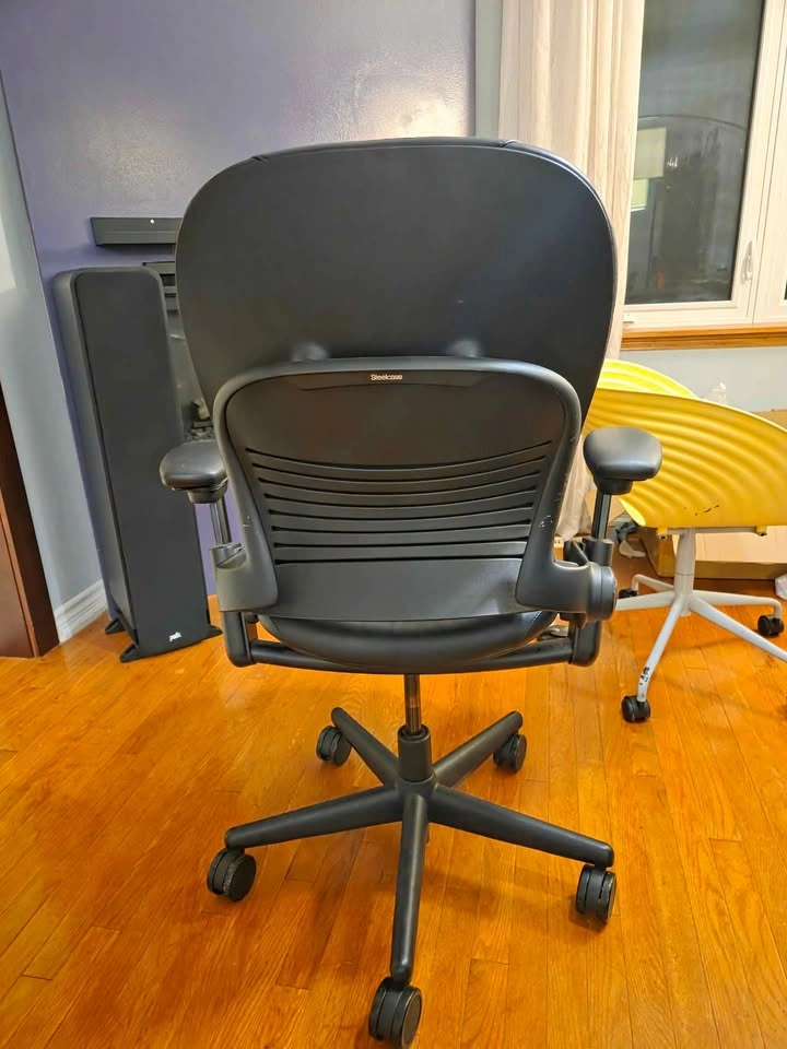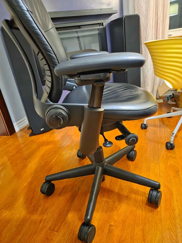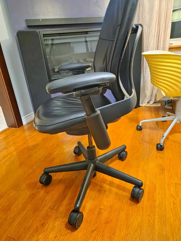 42Steelcase Leap V1 highback with leather padding. Cheaper than other v1 highbacks because: Gas cylinder is stiff/slow, chair doesn't go up or down easily 4d arm rests are stiff Does not have seat depth adjustment Missing adjustable lumbar support