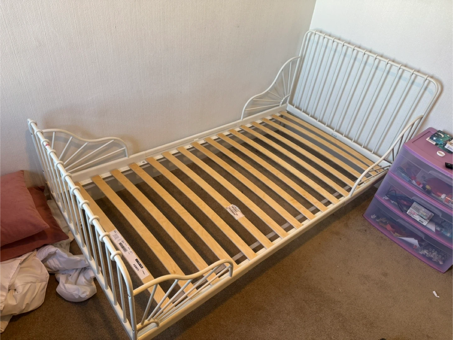 Selling an IKEA Vikare extendable bed frame. It's in great shape and perfect for a growing child. The frame is white and made of metal, providing a sturdy and stylish sleeping solution