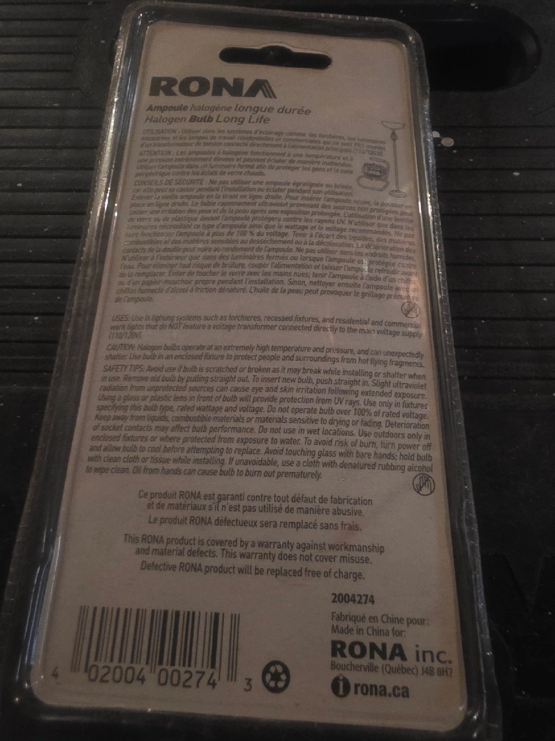 59Selling a RONA halogen bulb, designed for long life. It's a 100-watt bulb suitable for both indoor and outdoor use. The base is a RSC double contact base, T3-78mm. Made in China for RONA Inc in Boucherville, Quebec unit 1