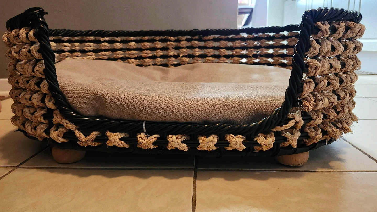 Beautiful, sturdy woven dog bed with a soft removable cushion. The frame is crafted from durable brown and black woven material, giving it a stylish and cozy look that fits nicely with any décor.