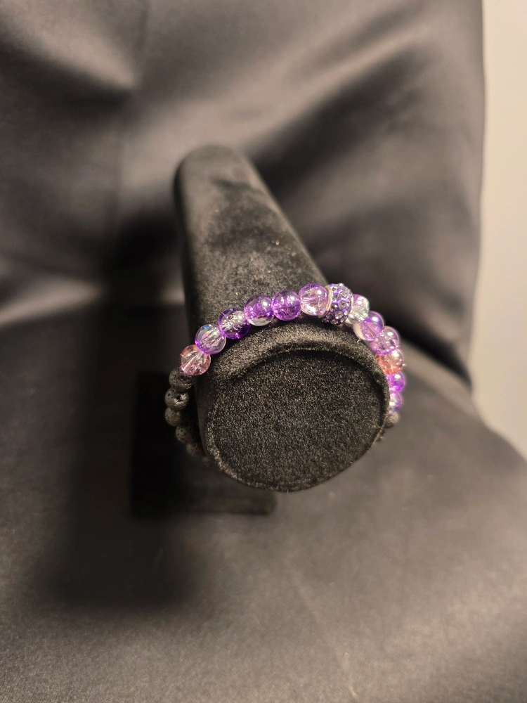 Selling a set of three handmade beaded bracelets. Each bracelet features a unique colour combination and lava stone accents. The set includes a red and black bracelet, a purple and clear bracelet, and a blue and clear bracelet. They're in great condition!