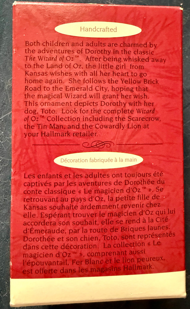 Relive the magic of Oz with this 1994 Hallmark Keepsake ornament featuring Dorothy and Toto from The Wizard of Oz. This ornament is a delightful collectible, perfect for adding a touch of nostalgia to your holiday decor. It's in great shape for its age, ready to hang on your tree and bring joy for years to come! This vintage ornament could be yours for $25. If the ad is still up, then yes, it's still available!