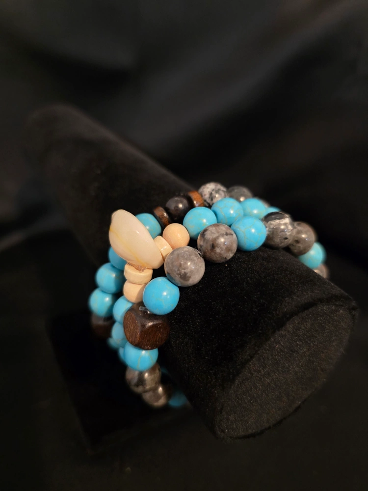 Check out this unique handmade bracelet! It features a mix of turquoise, wood, and grey stone beads. The combination of colours and materials gives it a really earthy, natural vibe. It's in great condition and would make a lovely addition to your jewellery collection