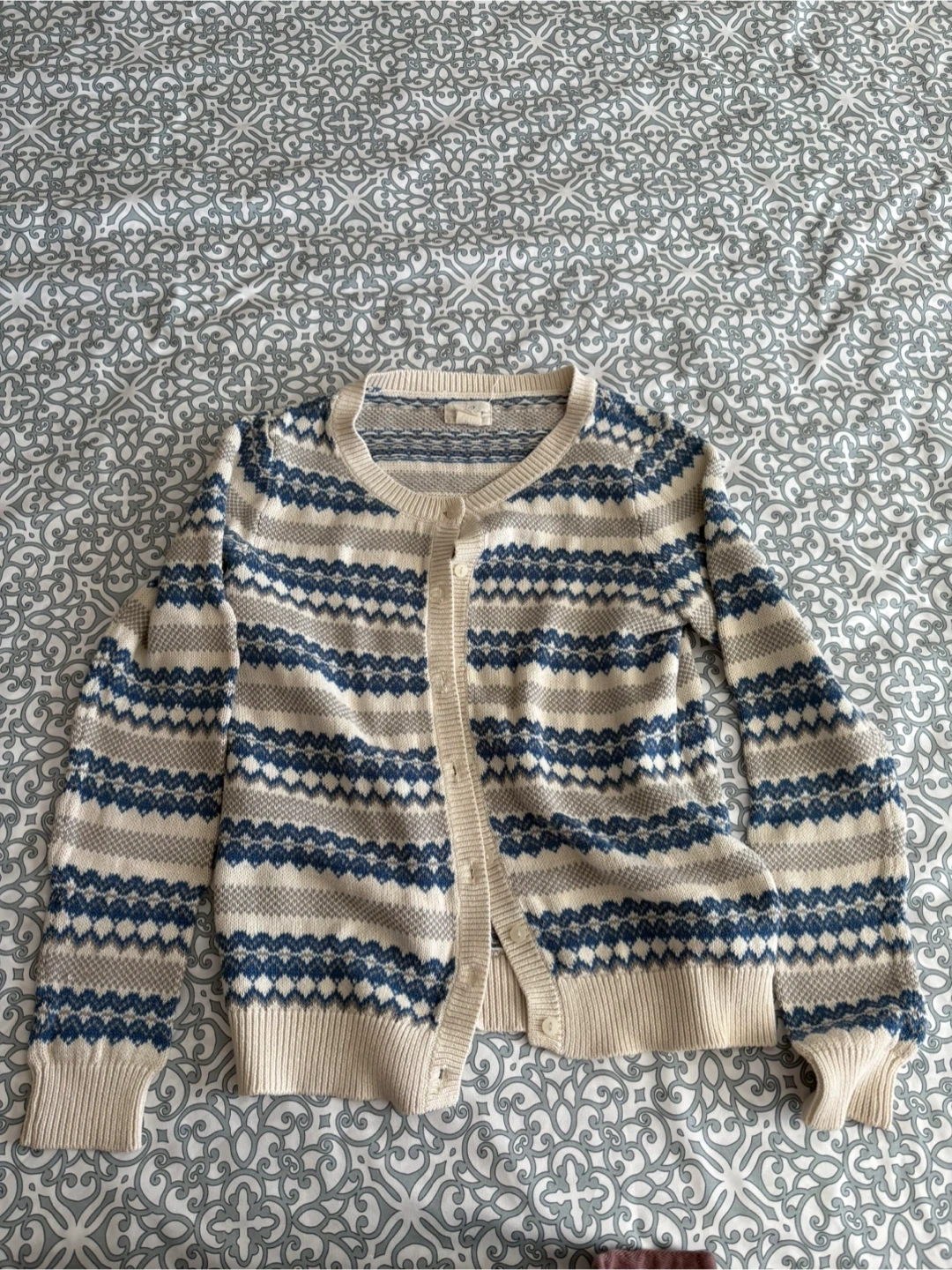 Here's a Talbots cardigan in a size small! It features a lovely patterned design in shades of blue, grey, and cream. It's in great condition and ready for a new home