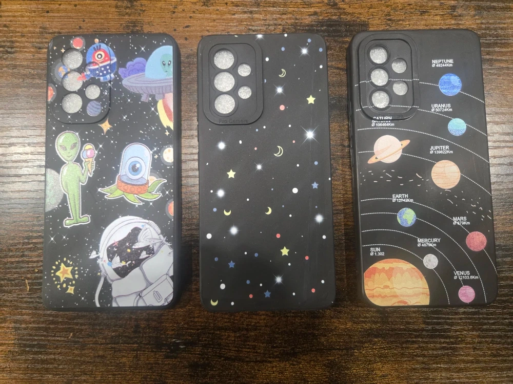 108Selling a set of three Brand New Samsung Galaxy A53 phone cases with fun space themes! There's one with aliens and astronauts, another with stars and moons, and a third with planets from our solar system. They're in great shape and ready for a new phone to protect!