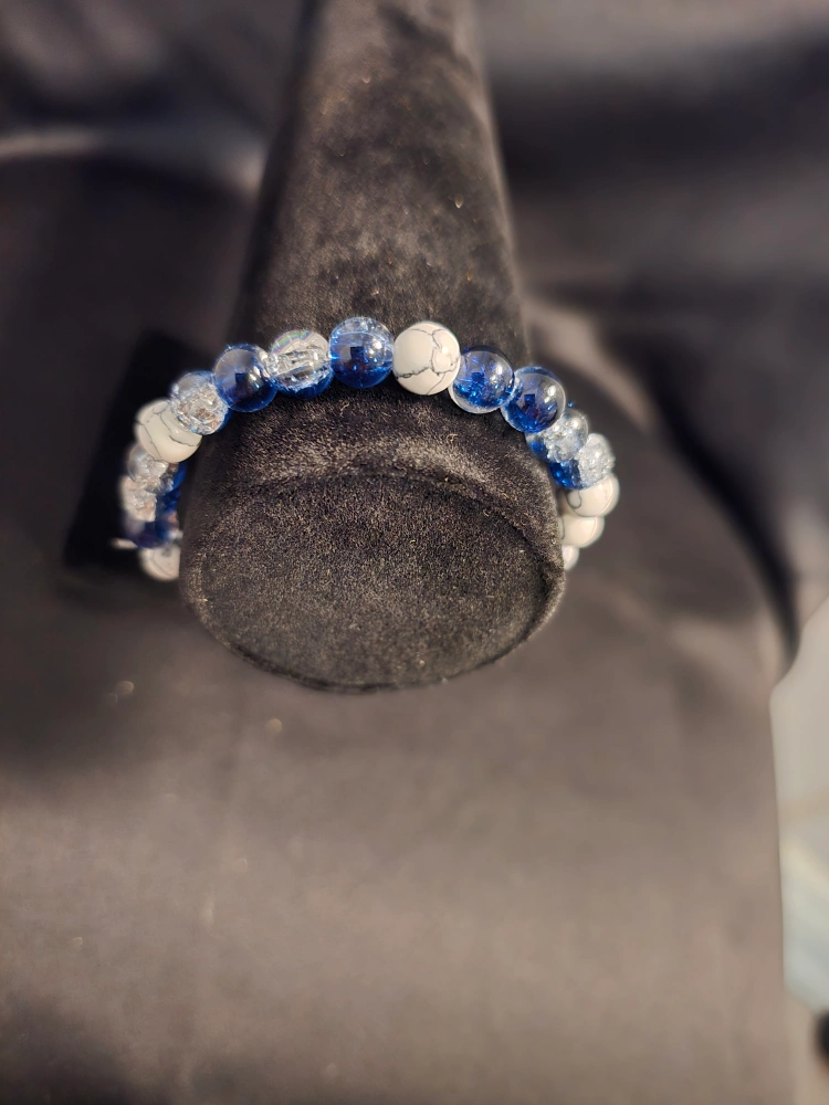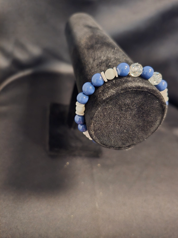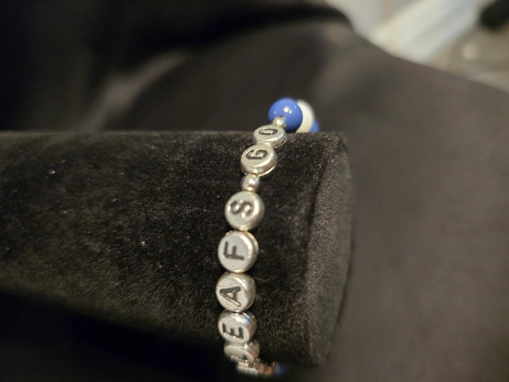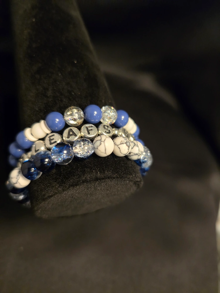 Show your team spirit with this Toronto Maple Leafs beaded bracelet! It features blue and white beads, some with the team's name spelled out, and a charm with the iconic maple leaf logo
