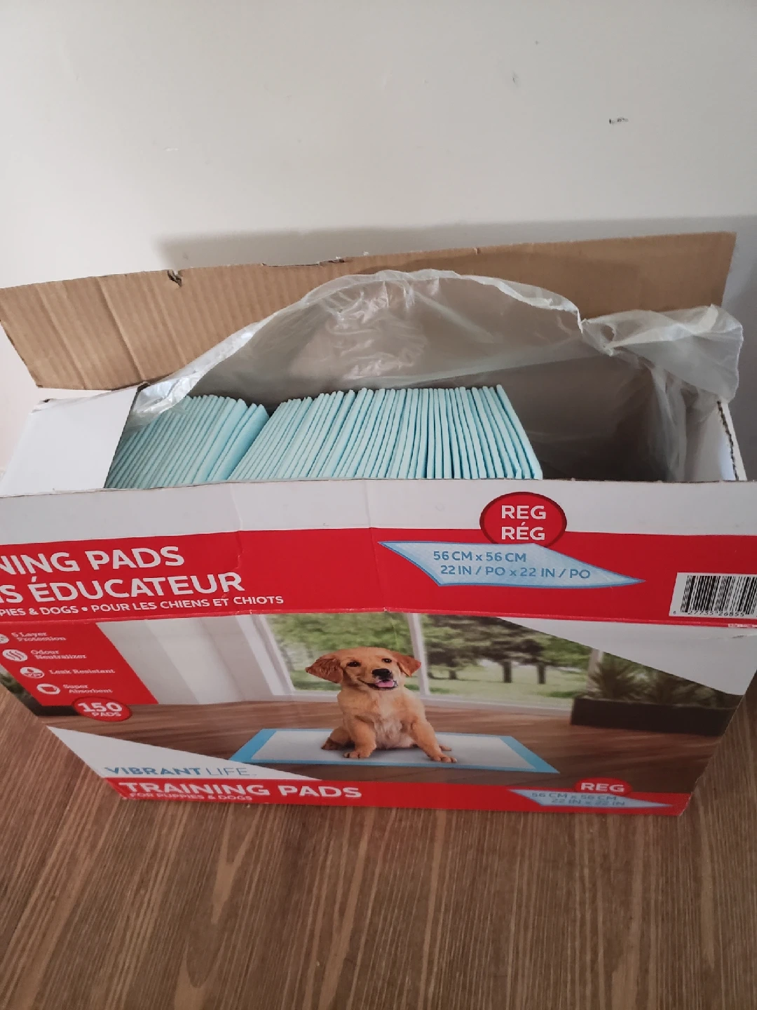 70Selling a box of Vibrant Life Training Pads for puppies and dogs. The box contains 150 regular-sized pads, each measuring 56 cm x 56 cm (22 in x 22 in). These pads are great for house training your furry friend!