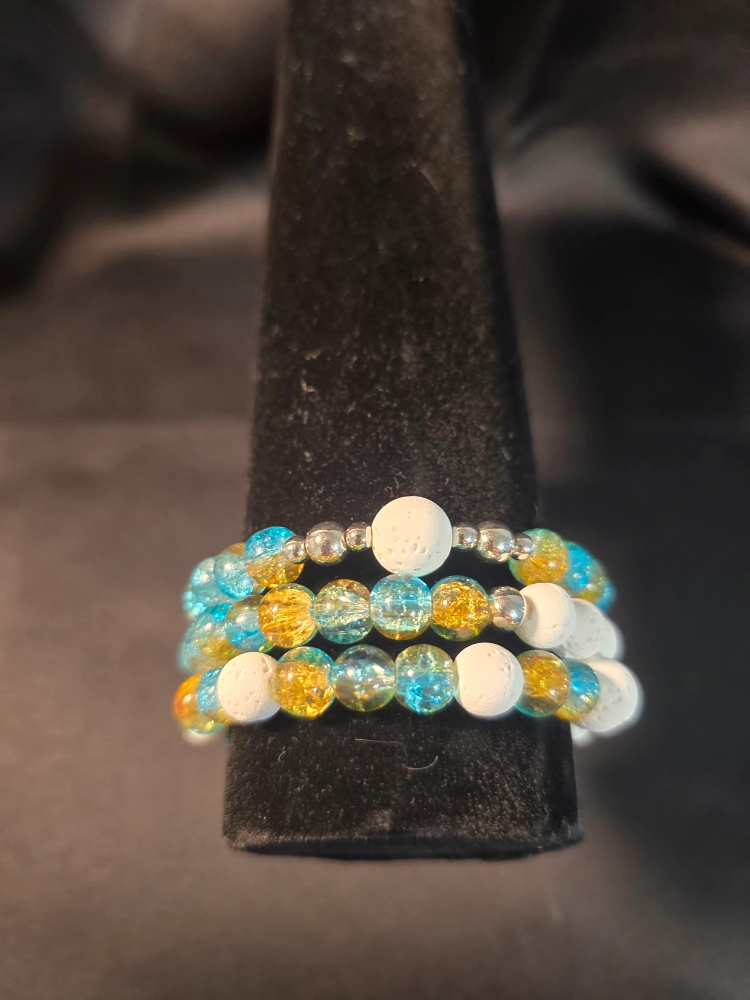I'm selling a beaded bracelet featuring a mix of blue, gold, and white beads. It's in great condition and would make a lovely addition to any jewelry collection!