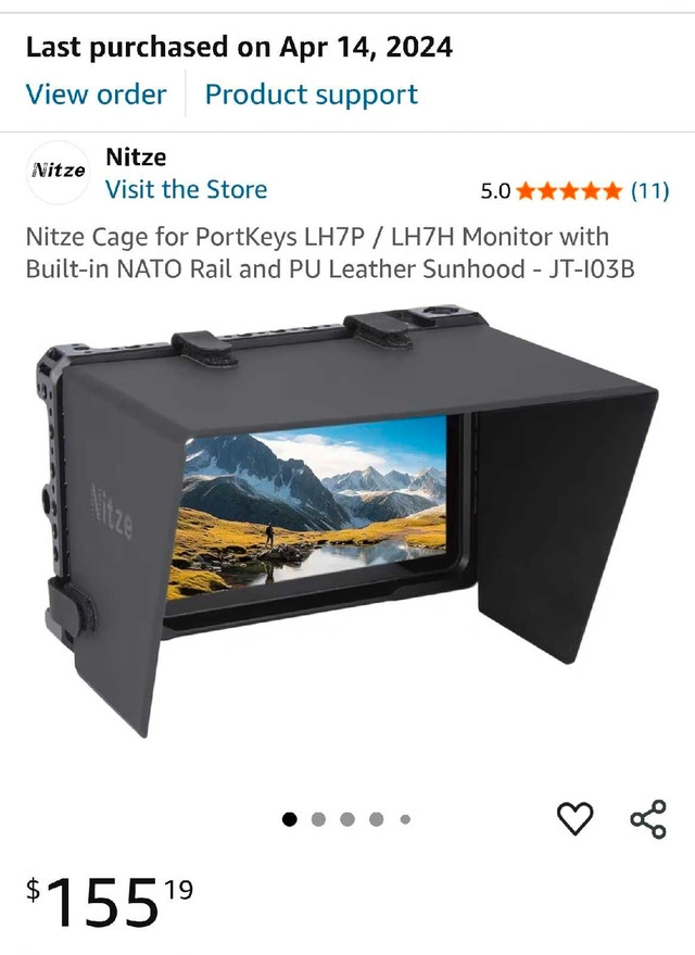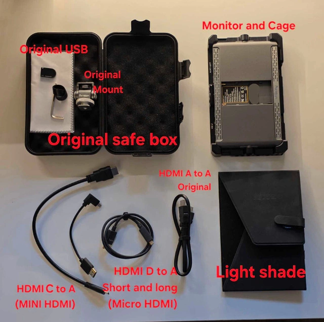 The LH7H Monitor and cage are both in like brand new condition, having been used less than 10 times, mostly indoors. The cage and shade are by Nitze. None of the items have ever been dropped or disassembled, and there are no dents. Some scratches may be observed on the light shade as it is made of soft material, but there shouldn't be any obvious marks on the monitor display or body. Accessories as shown in the picture also comes with additional HDMI cable for free, so you'll only need an NPF battery and you're ready to go. Pick up in Oakville, near Trafalgar and Dundas.