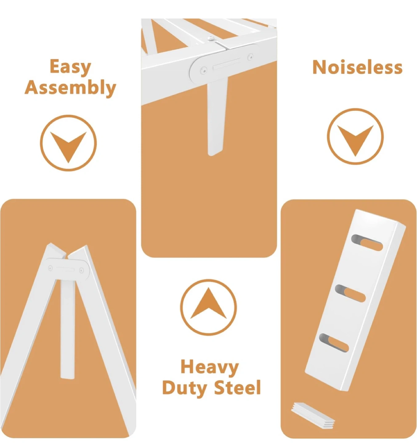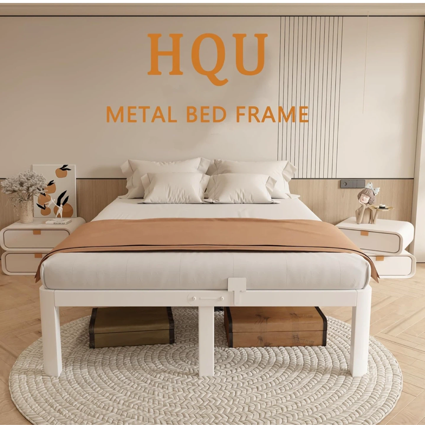 23Selling a full-size metal bed frame from HQU! It's a sturdy platform that doesn't need a box spring. The frame is white and measures 74.5" x 53.5". It also has 12.4" of under-bed storage space. Perfect if you need some extra room!..a