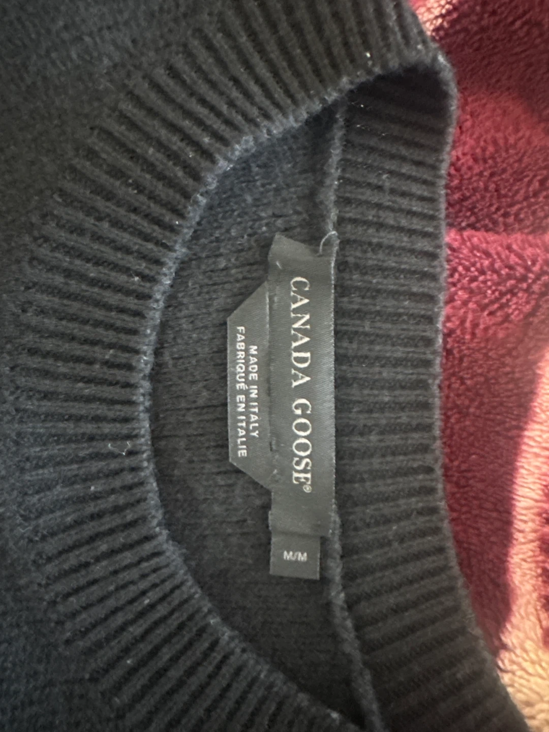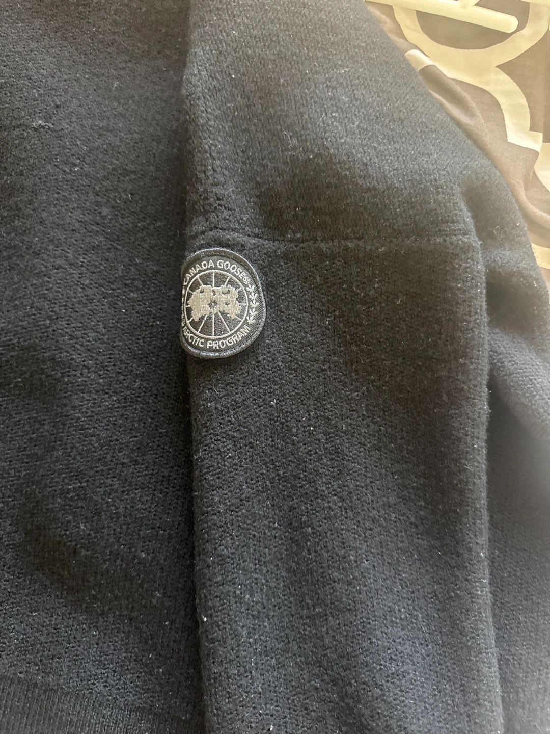 Selling a Canada Goose black sweater in size medium. It's in great condition and made in Italy. The material feels really nice and warm, perfect for the Canadian weather!