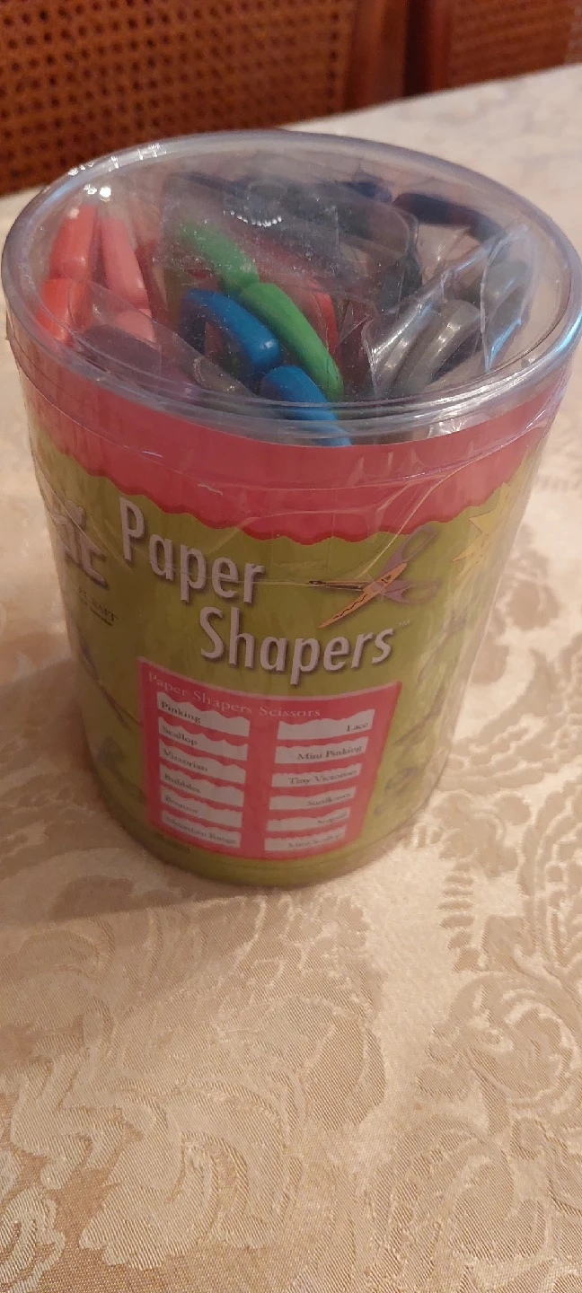 Selling a set of EK Success Paper Shapers scissors. The container includes 12 different scissors. Keep kids occupied with crafts...off those devices!