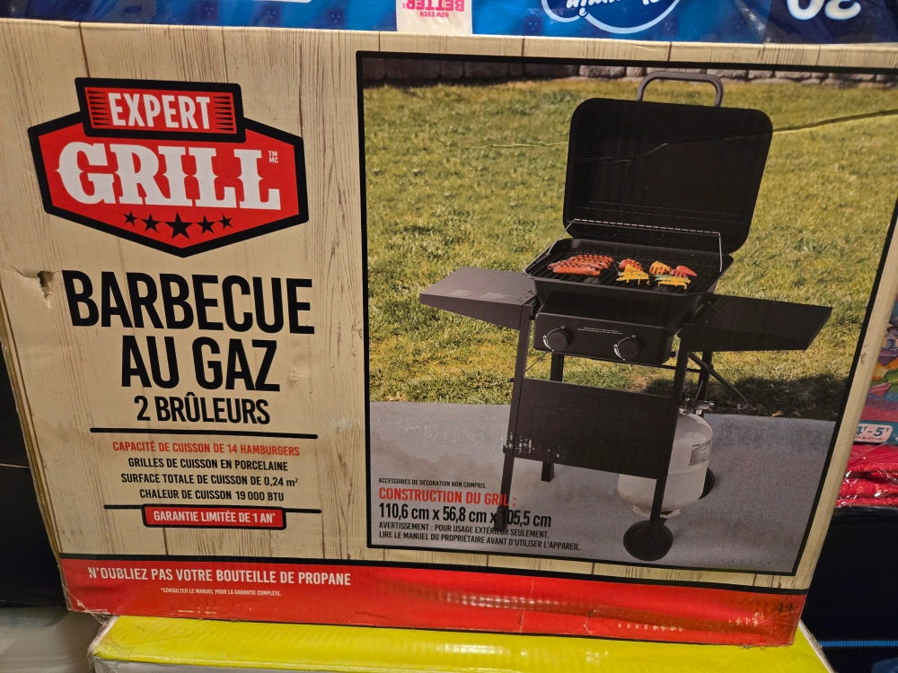 Selling an Expert Grill 2-burner propane BBQ. It has porcelain-coated cooking grates and a cooking surface of 0.24 m². The heat output is 19,000 BTU. The assembled grill dimensions are 110.6 cm x 56.8 cm x 105.5 cm