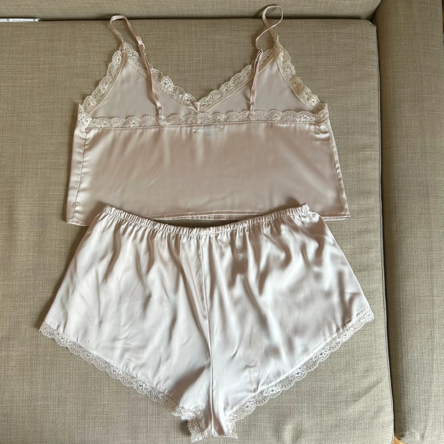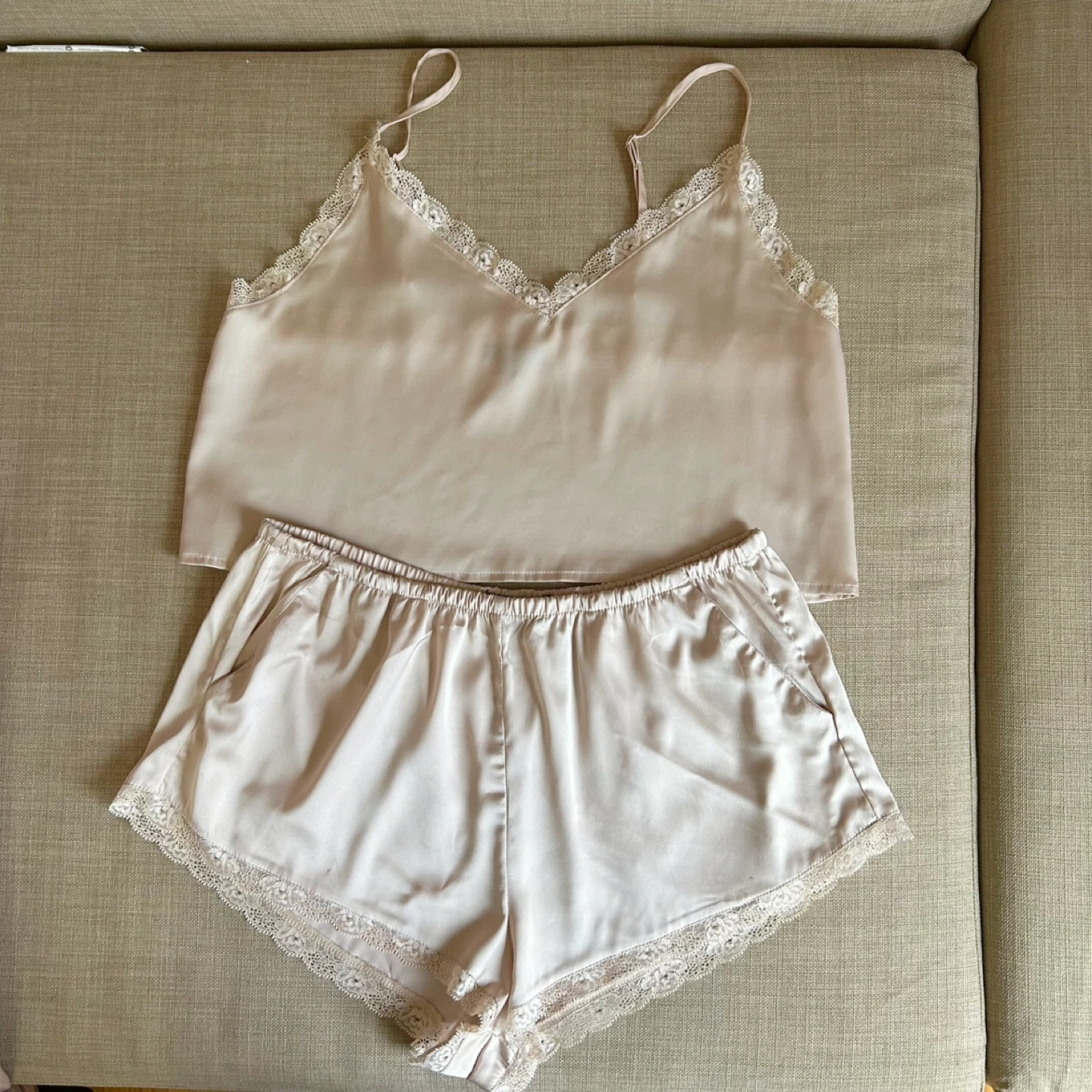 Selling a cute Dynamite Satin pajama set! Top is size small & bottoms are size medium. It's a light beige colour with lace trim. Perfect for a comfy night's sleep!