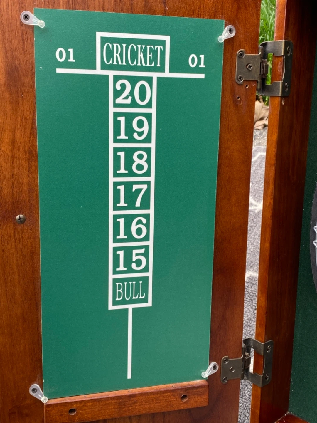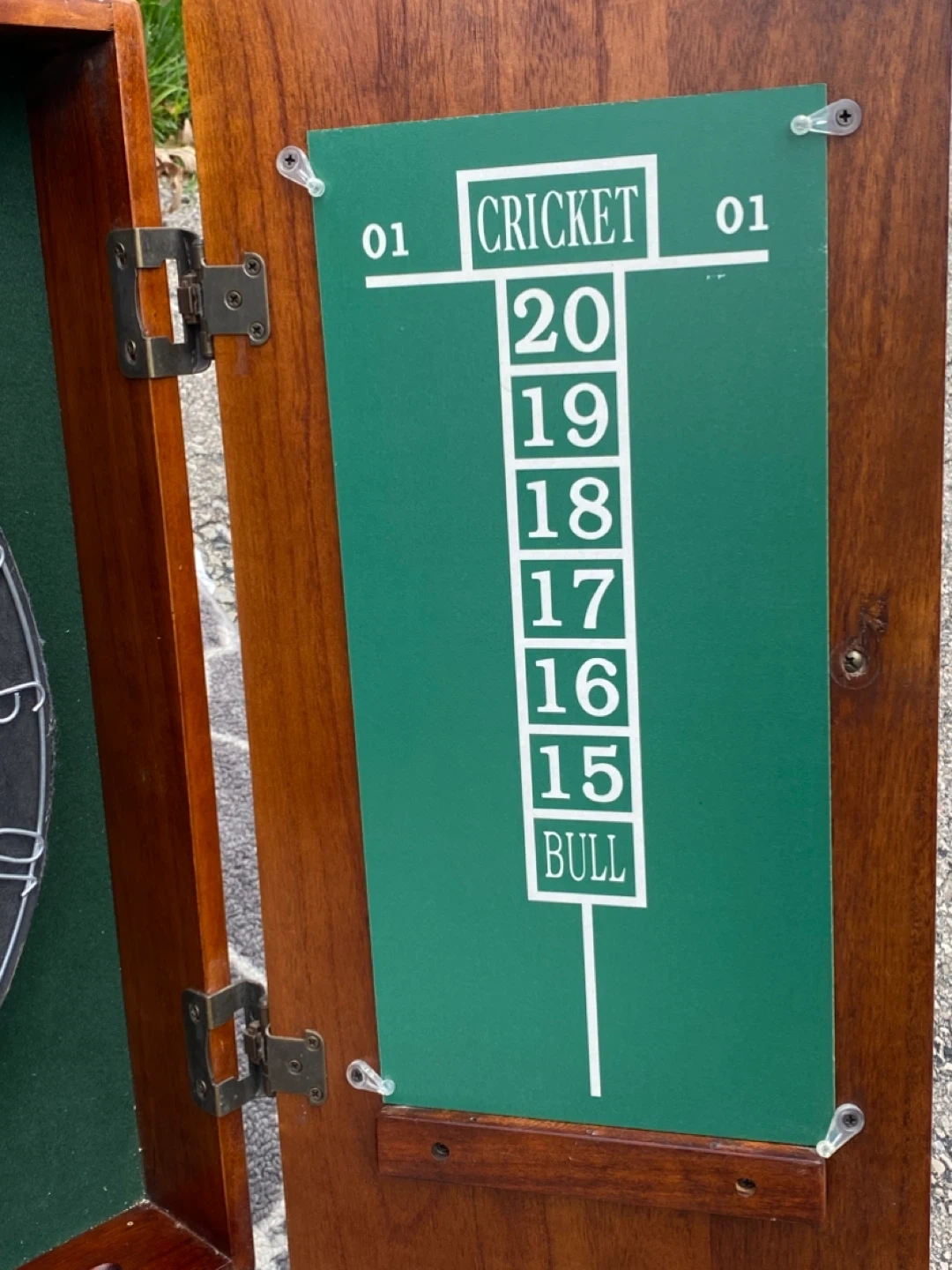 Green chalkboards are on the inside of the cabinet and used for scoring. (never used)