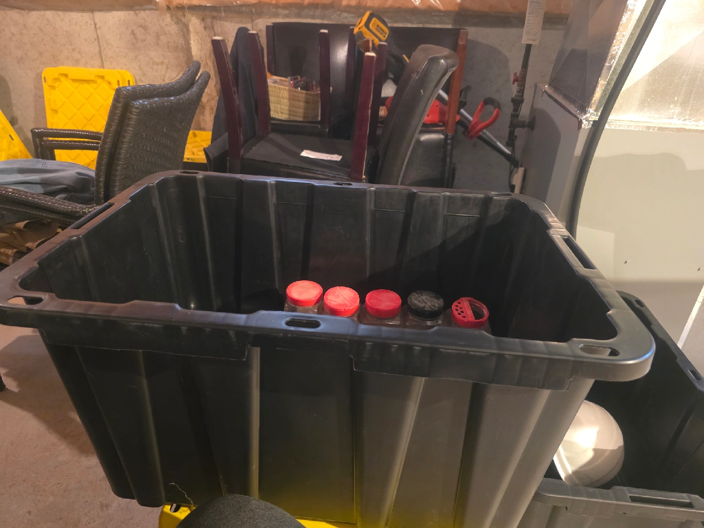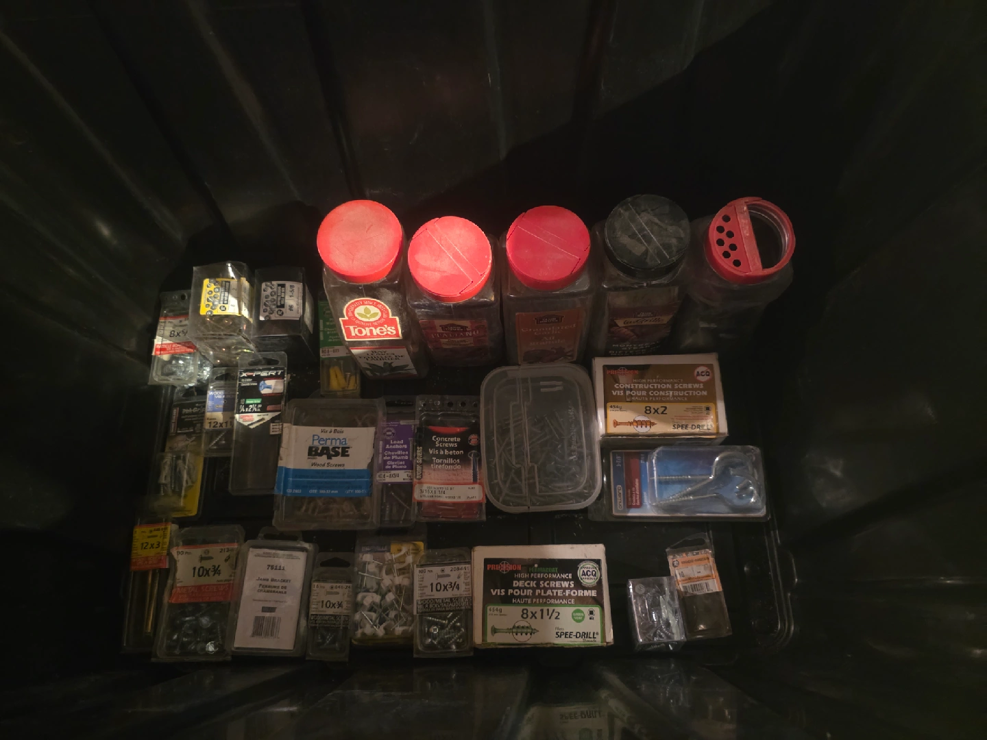 59I have a black storage tub filled with various hardware items. It includes nails, screws, and other fasteners. Perfect for organizing your workshop or garage! tapcons drywall screws etc. unit 2