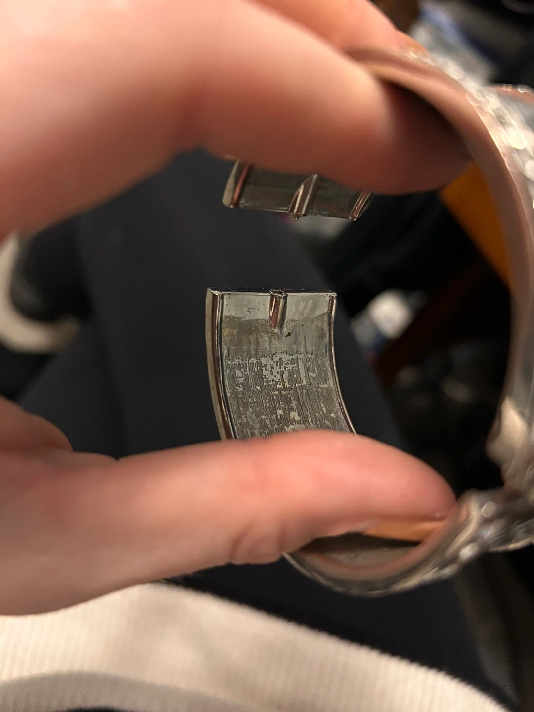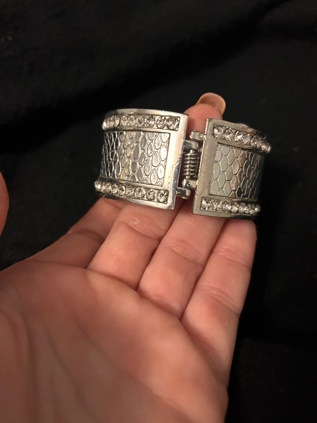 Selling a silver cuff bracelet with rhinestone detailing. It has a leather textured pattern and a hinged closure. It is missing two rhinestones, but it’s in great shape otherwise. See photos