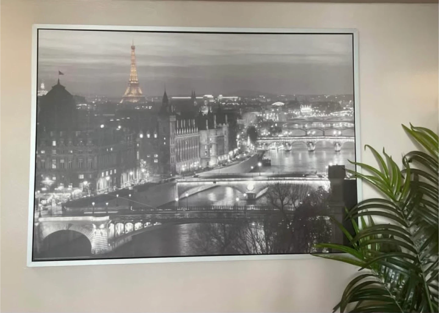65Beautiful framed IKEA wall art featuring a black-and-white cityscape of Paris with the Eiffel Tower glowing in the background. Adds a classic, modern touch to any space perfect for living rooms, bedrooms, or offices. Easy to hang, lightweight frame. Please do not hesitate to ask any questions.