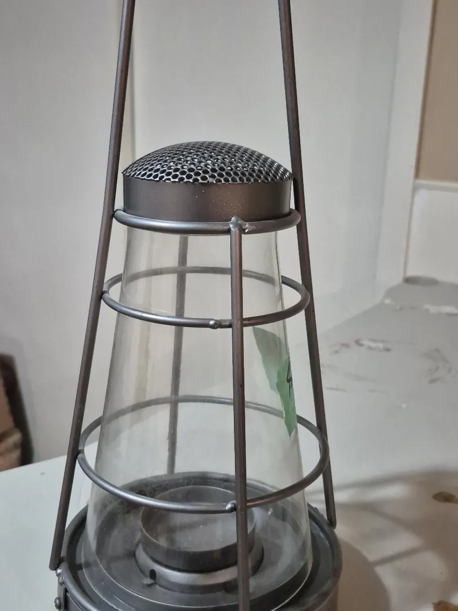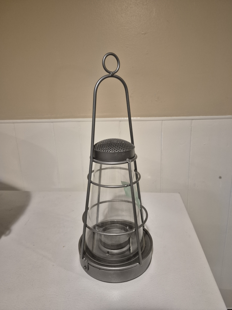 Here's a stylish lantern with a metal frame and glass enclosure. It's in great shape and would look lovely in any room or even on a patio. Perfect for creating a cozy atmosphere