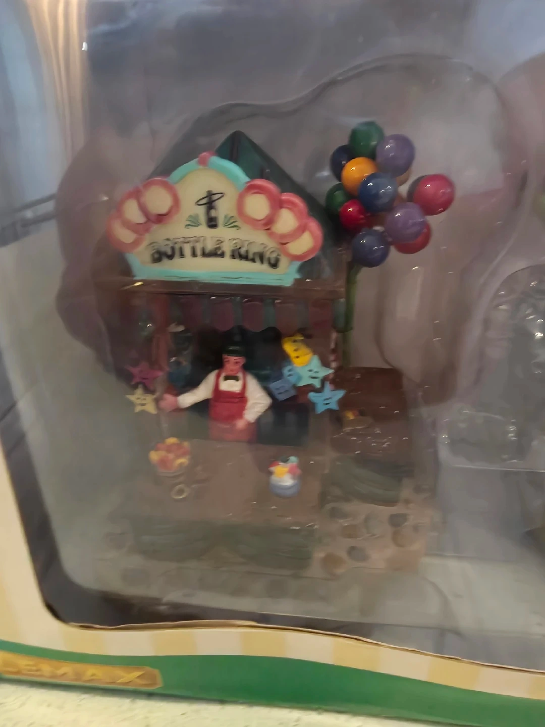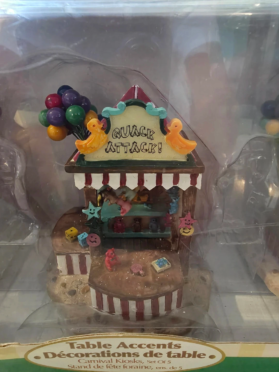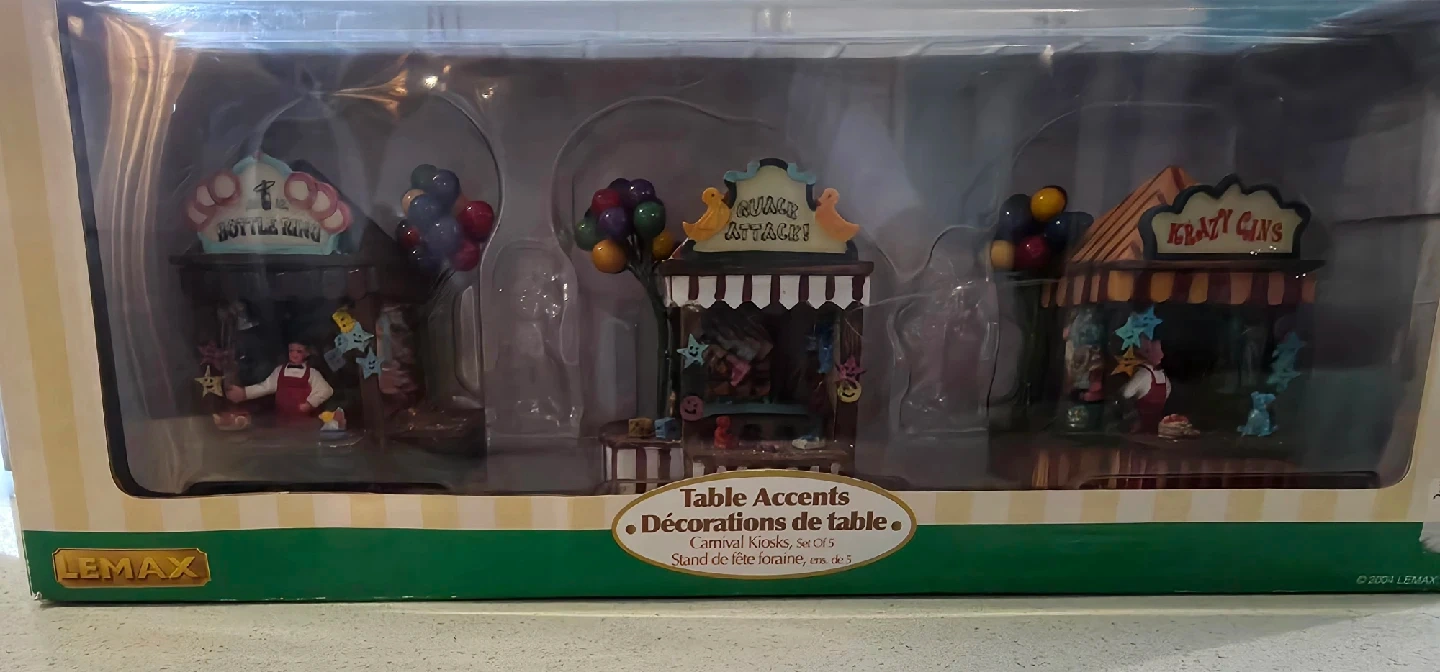60Selling a Lemax Table Accents Carnival Kiosks set of 5. This set includes adorable miniature carnival kiosks, perfect for adding a touch of whimsy to your table decor! The set includes 'Quack Attack!', 'Bottle Ring', and 'Krazy Cans' kiosks.