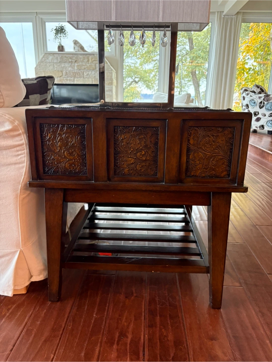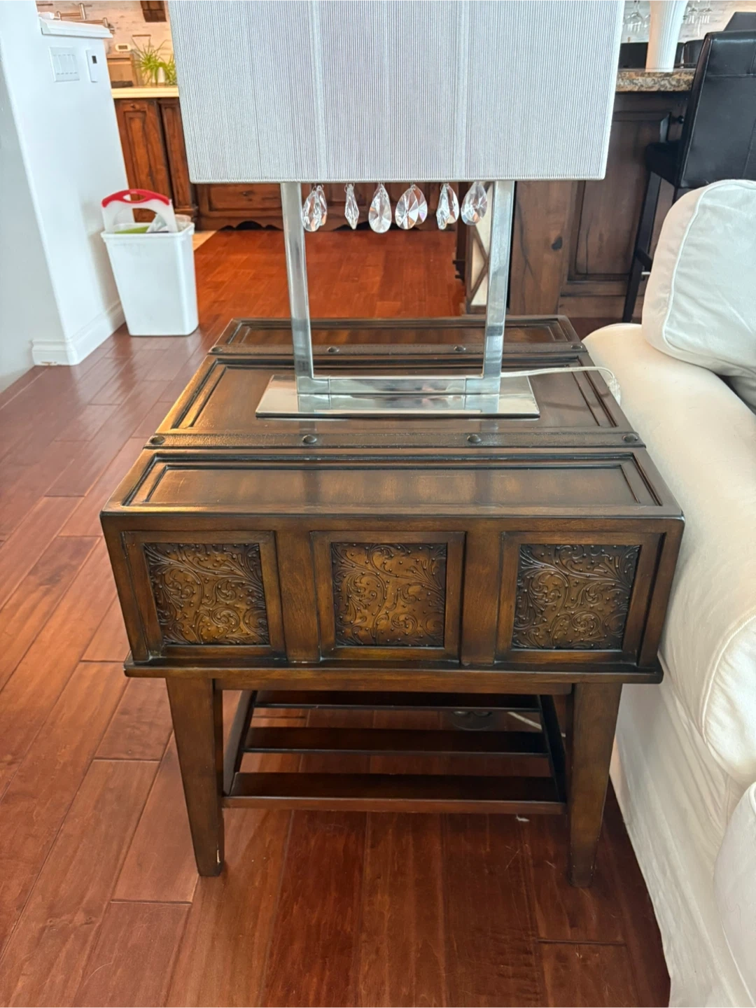 A set of wooden end tables with a built-in drawer. The table features detailed carvings and a shelf at the bottom for extra storage. Perfect for adding a touch of elegance to any room!