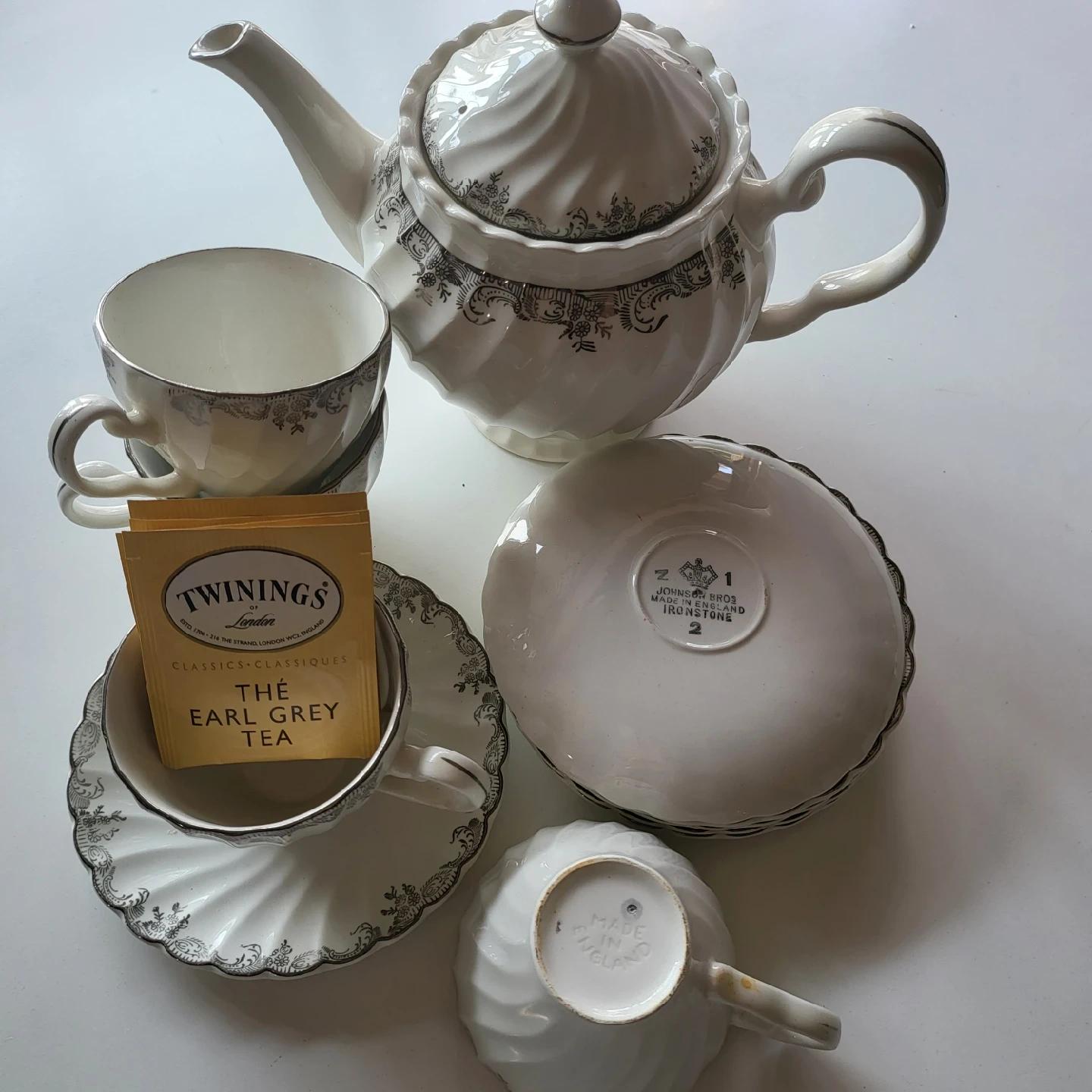60Selling a lovely Johnson Bros Ironstone tea set, made in England! The set includes a teapot, cups, and saucers, all in great condition with a classic design. Perfect for tea time or as a decorative piece