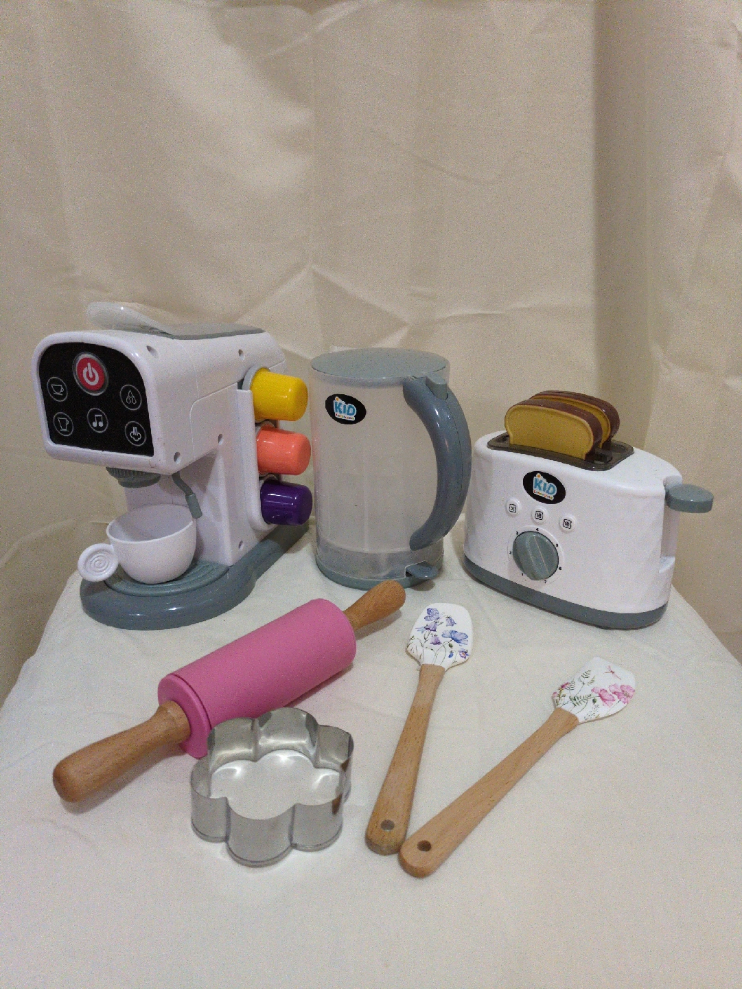 A charming toy kitchen appliance set for your little chef! Includes a coffee maker, kettle, toaster, rolling pin, cookie cutter, and two spatulas. Perfect for imaginative play and kitchen fun!