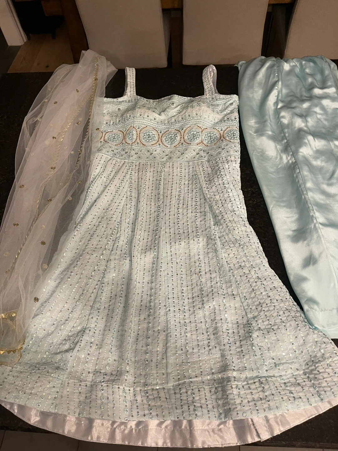 Beautiful sky blue Indian Anarkali dress with matching pants and dupatta. The dress has intricate detailing and is perfect for a special occasion. The material feels high quality and the colour is stunning!