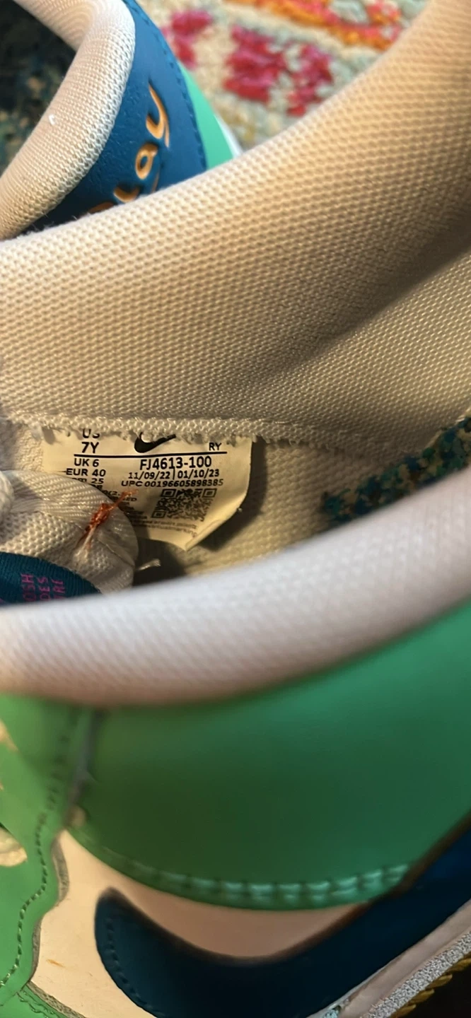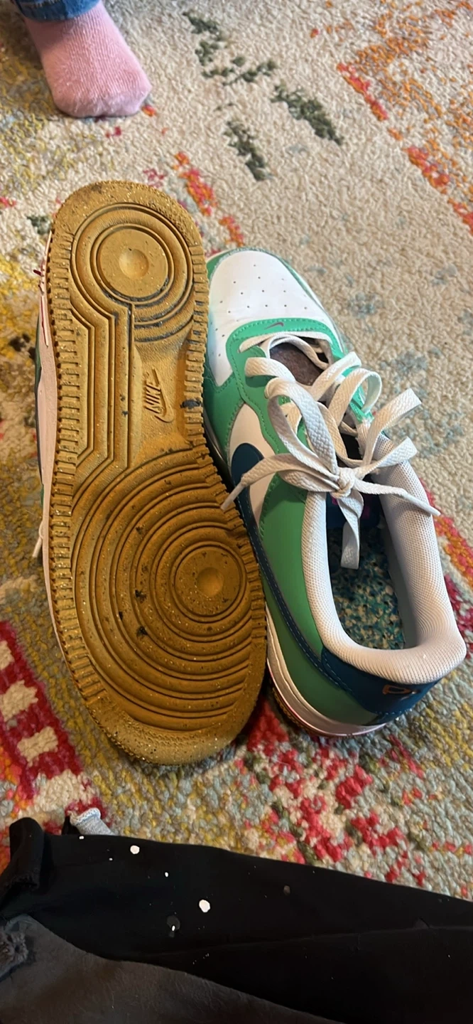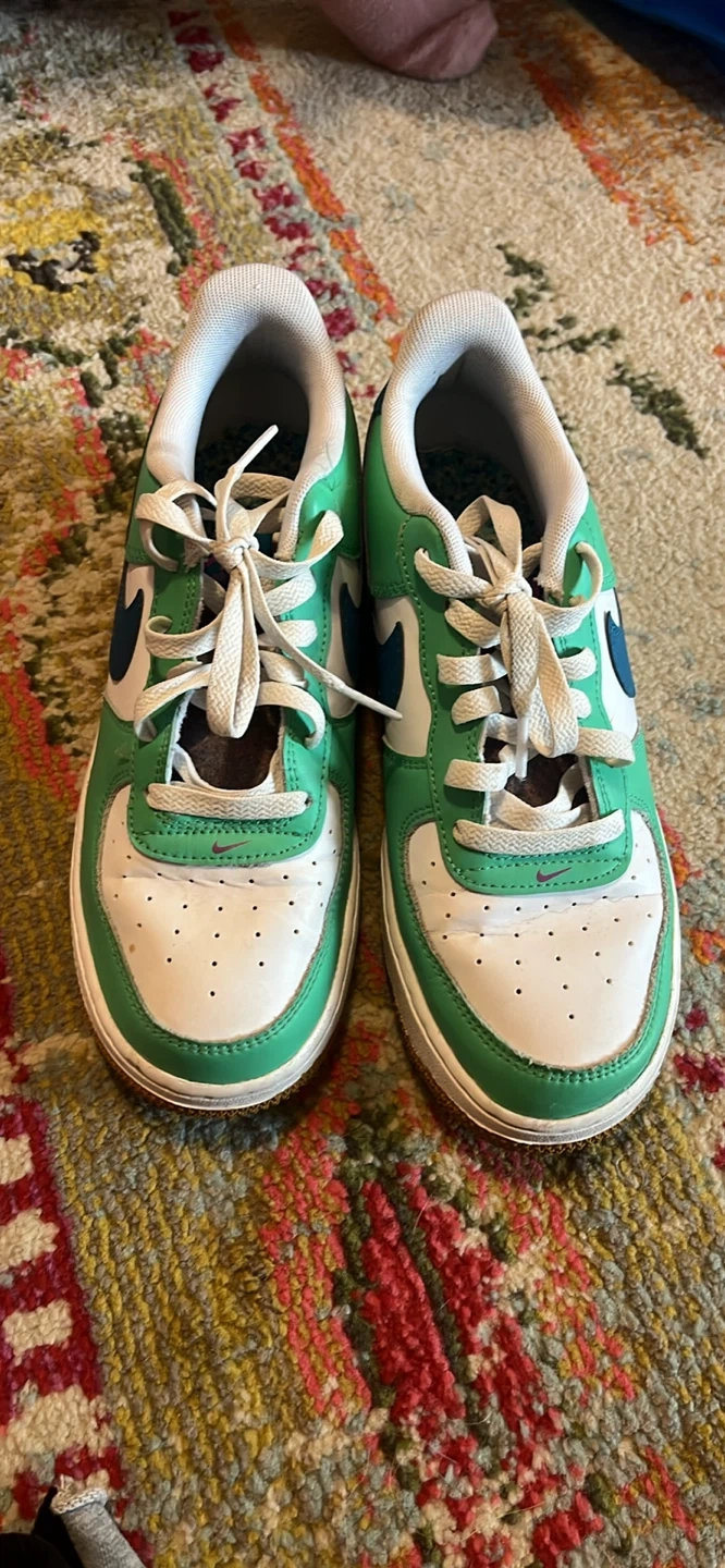 20Selling a pair of Nike Air Force 1 sneakers in green and white, size 7Y. They're in used condition, as shown in the photos, but still have lots of life left!