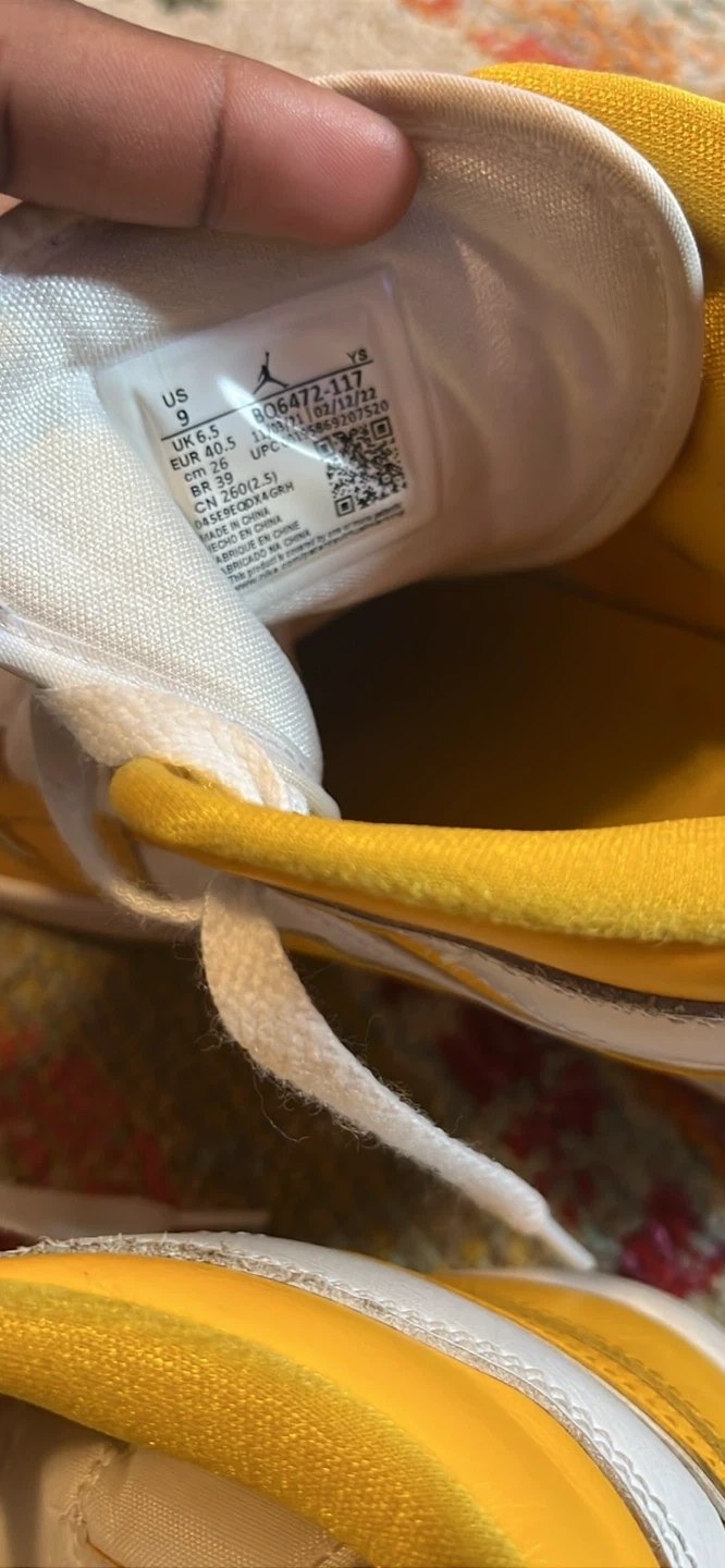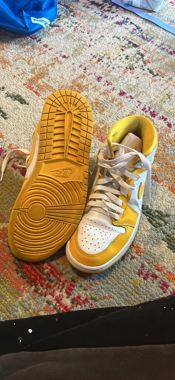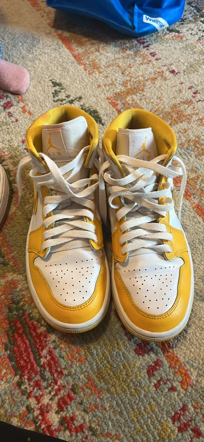 20Selling a pair of Nike Air Jordan 1 Mid sneakers. They are a vibrant yellow and white colour combination. Size 9 US, see the tag in the photos!