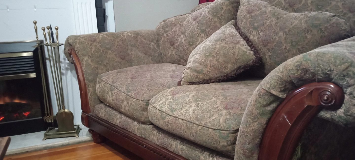 Selling a sofa,. It has a classic design with wooden armrests and comfortable cushions. Perfect for adding a touch of elegance to your living room!