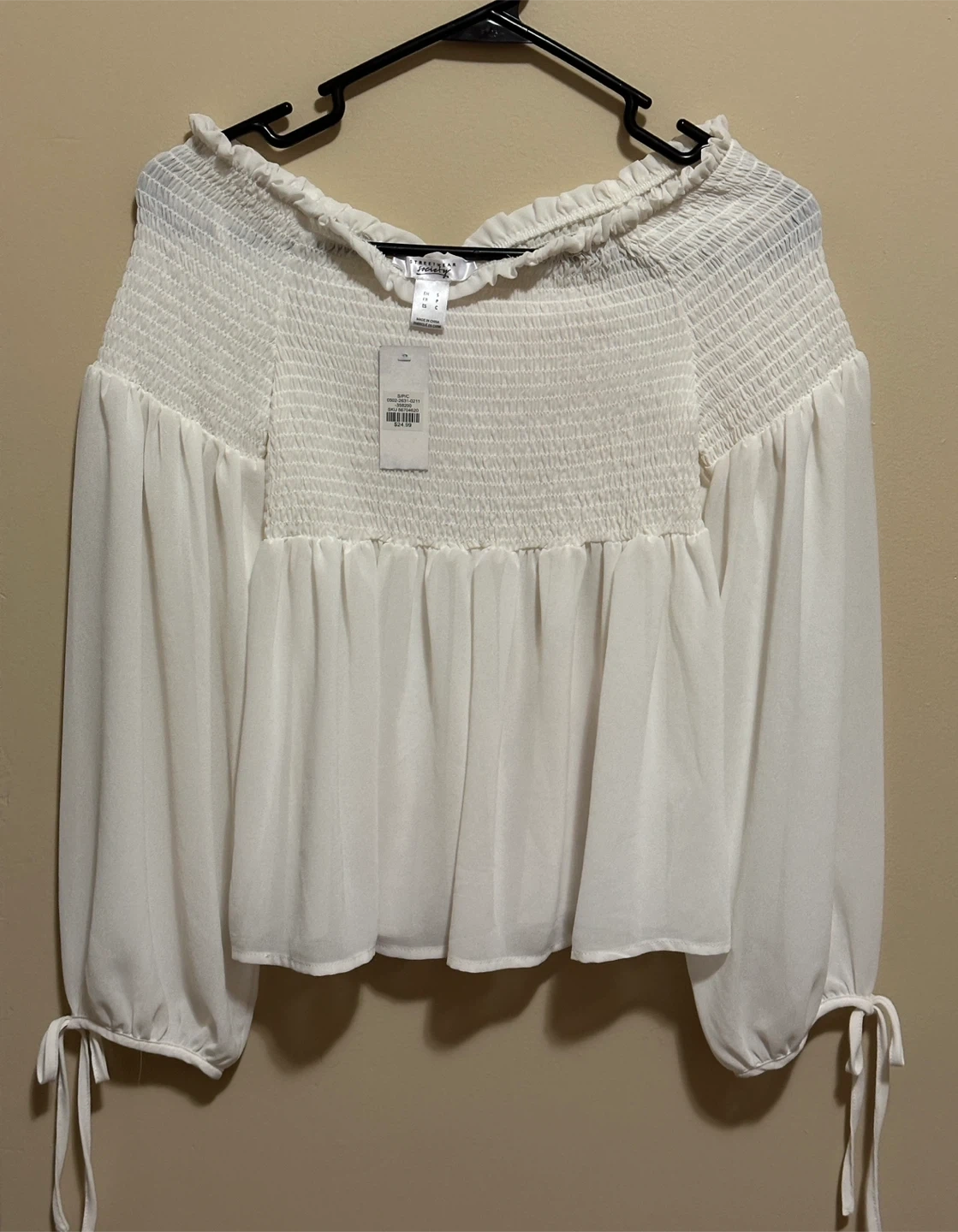Here's a brand new Streetwear Society blouse! It's a beautiful white off-the-shoulder style, perfect for any occasion. The size is S. Originally bought for $24.99