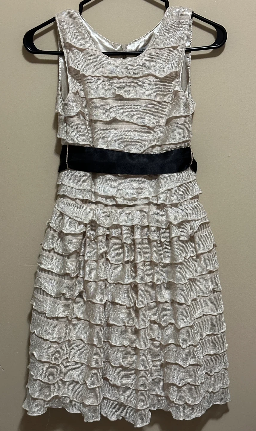 This is a beautiful dress from Turó Parc in size 10. It features a lovely layered design with a black belt accent. Perfect for special occasions or a night out!