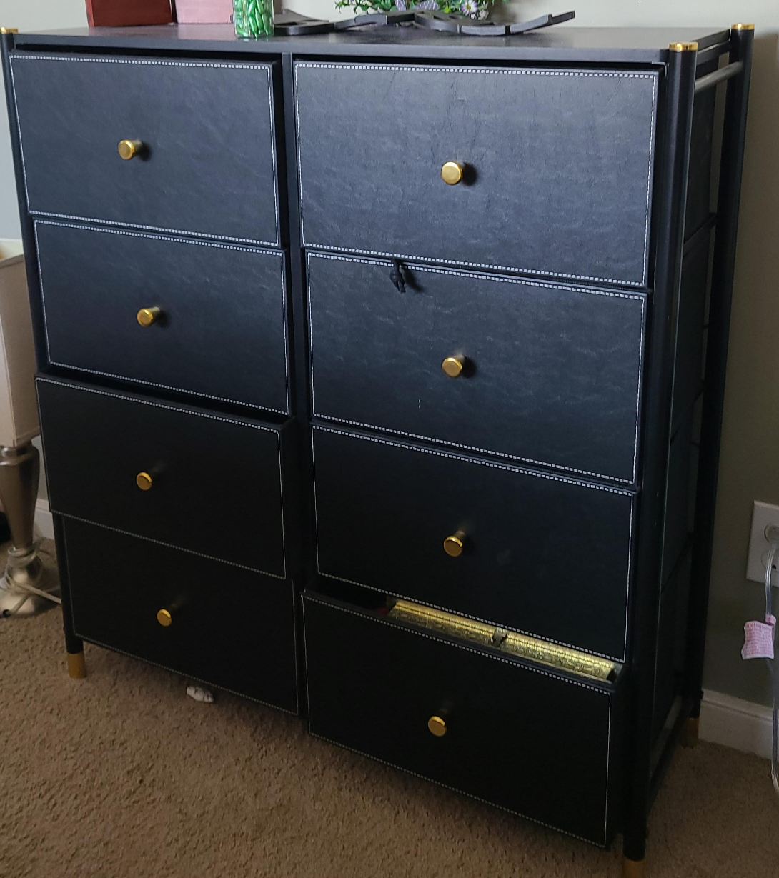Looking to sell this dresser! It features a sleek black finish with stylish gold accents. It has eight drawers, providing ample storage space. The dresser is in good condition and would be a great addition to any bedroom or living space