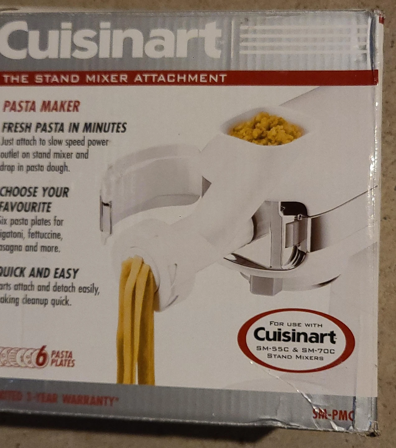 Selling a Cuisinart pasta maker attachment! It attaches to your stand mixer and lets you make fresh pasta in minutes. It's quick and easy to attach and detach, making cleanup a breeze. Comes with six pasta plates for rigatoni, fettuccine, lasagna, and more