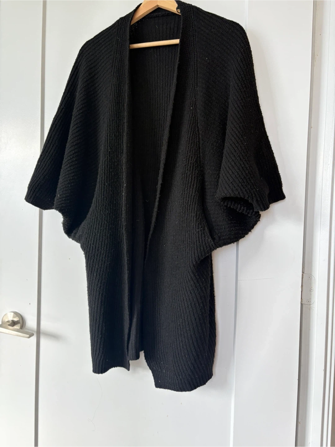 84Here's a cozy black knit cardigan that's perfect for layering! It's a one-size-fits-all style, so it's super versatile. The material is soft and comfortable, making it great for wearing around the house or out and about