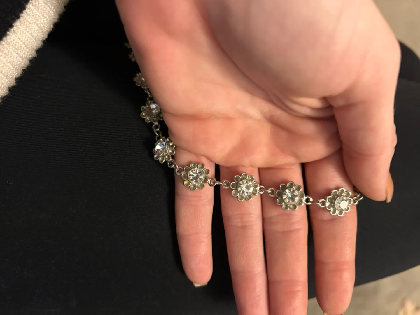 Delicate and sparkly, this handmade floral anklet features a series of linked metal flowers, each centered with a shimmering rhinestone. Designed and crafted (by myself!) 25 years ago with love and good energy, it carries my well wishes with every segment. lightweight, adjustable, and comfortable to wear.