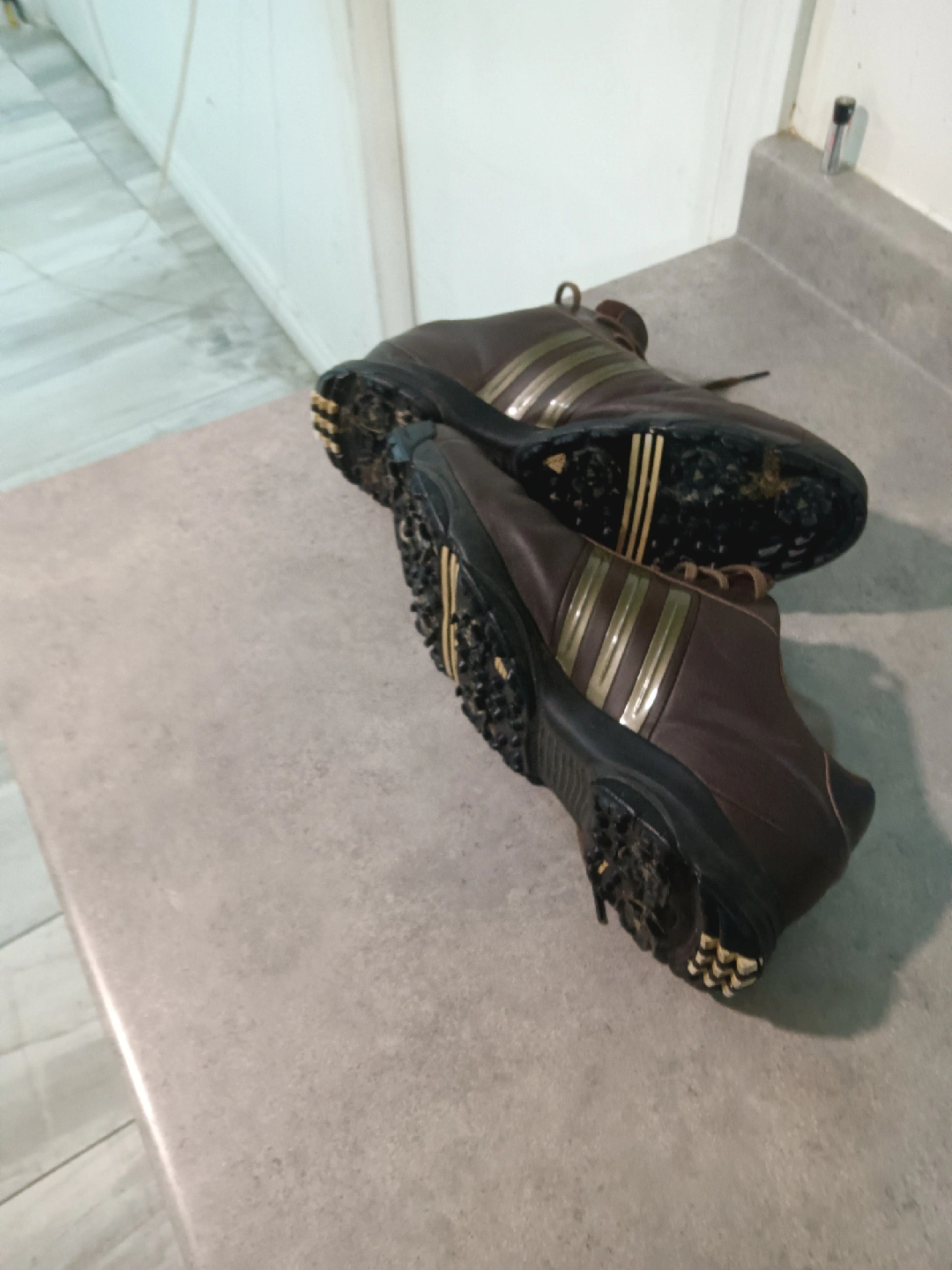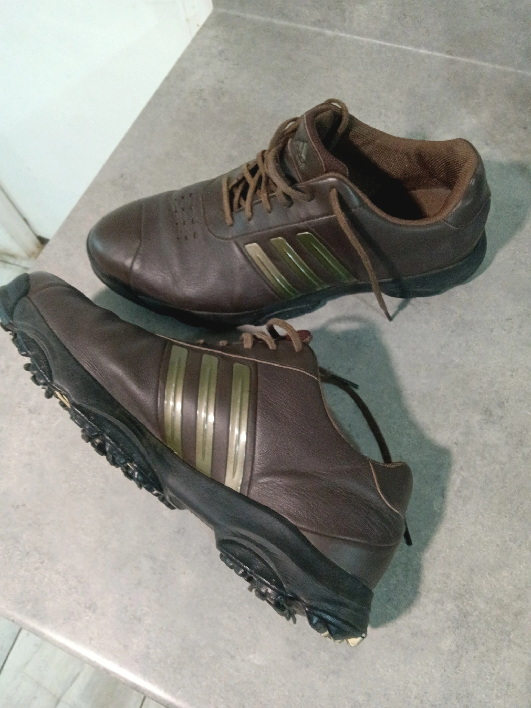 Selling a pair of Adidas golf shoes in brown leather. They show some signs of wear but are still in good condition for hitting the links! The soles have good grip, and the leather is still supple. Great for anyone looking for a comfortable and stylish pair of golf shoes.