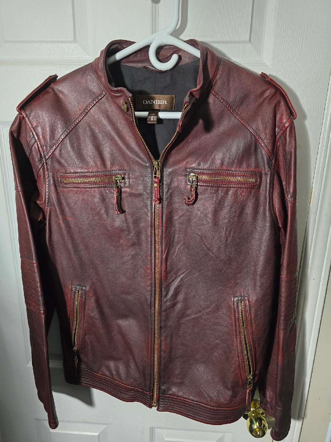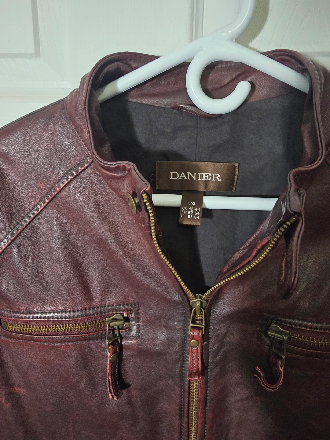 A sleek deep-burgundy Danier leather jacket (Size L) -- pristine, barely worn, and kept safely tucked away in a closet, that offers timeless style and premium craftsmanship.