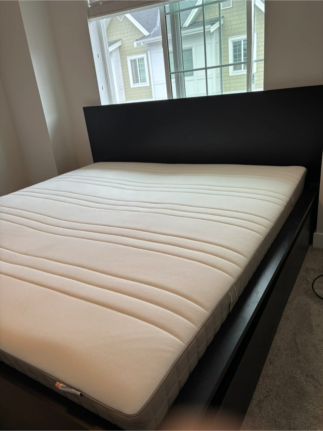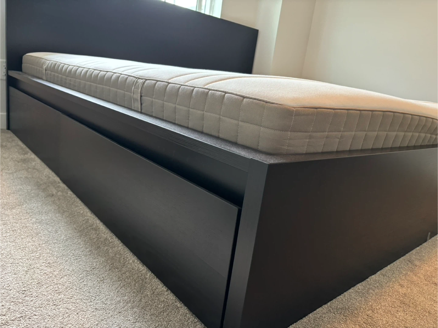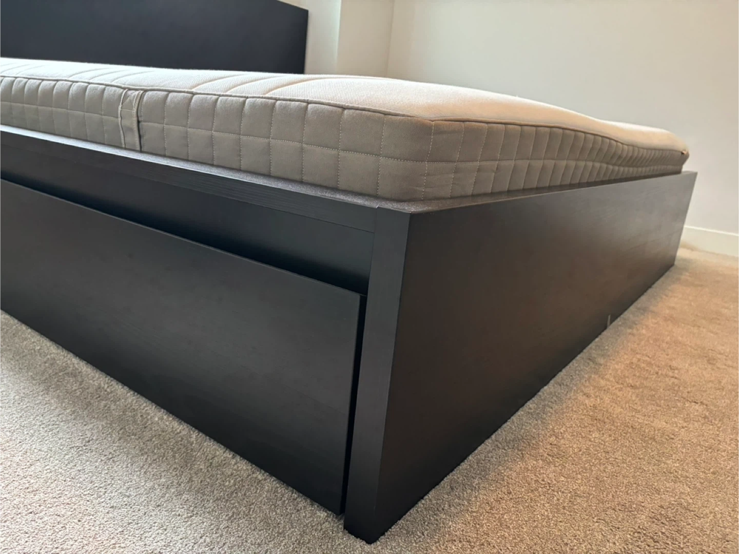 Selling a gently used IKEA Malm King size bed frame in black. It's in great shape and comes with four large pull-out drawers on the side. Mattress not included.