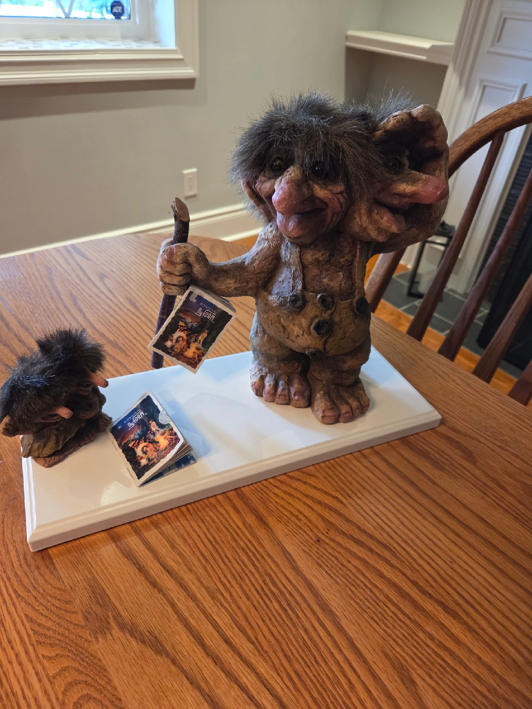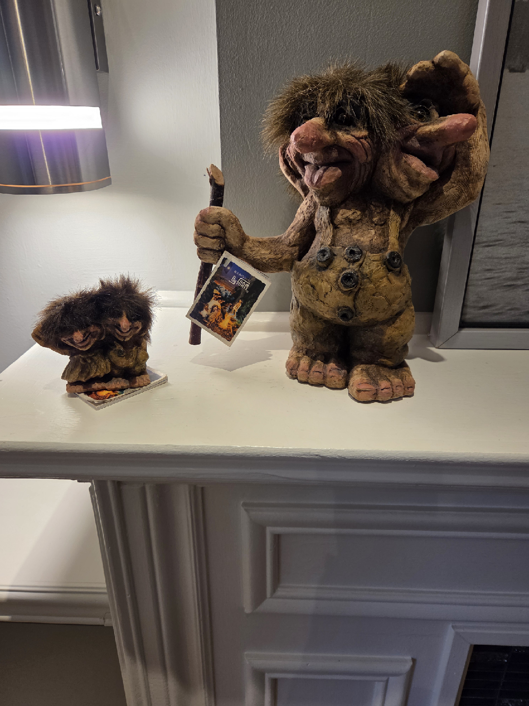 These are vintage Dam troll figures in good condition. One is a large troll holding a stick with a picture, and the other is a smaller troll.