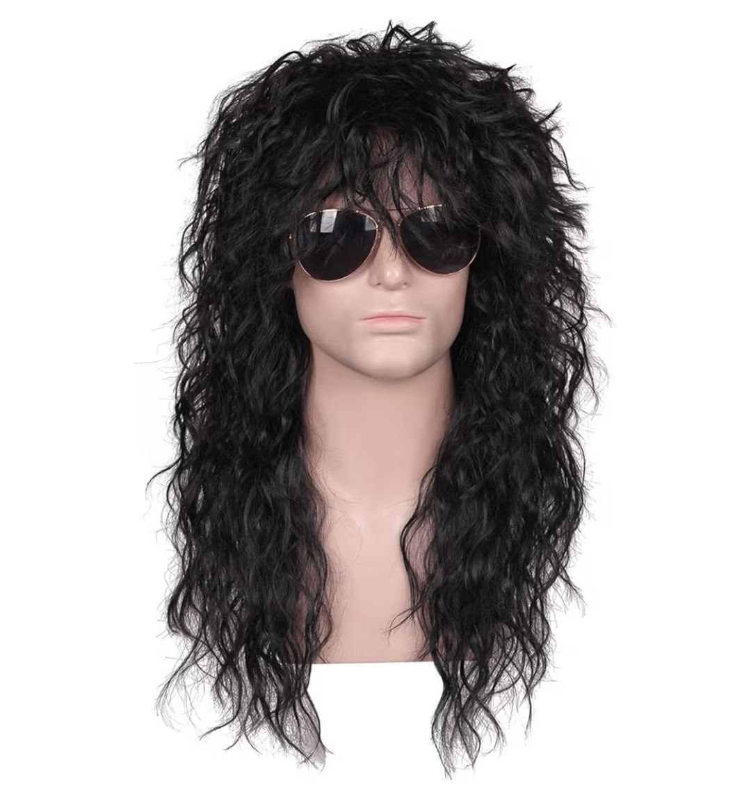 Get ready to rock with this cool black curly rocker wig! It comes with a pair of stylish sunglasses to complete the look. Perfect for costumes, parties, or just having some fun
