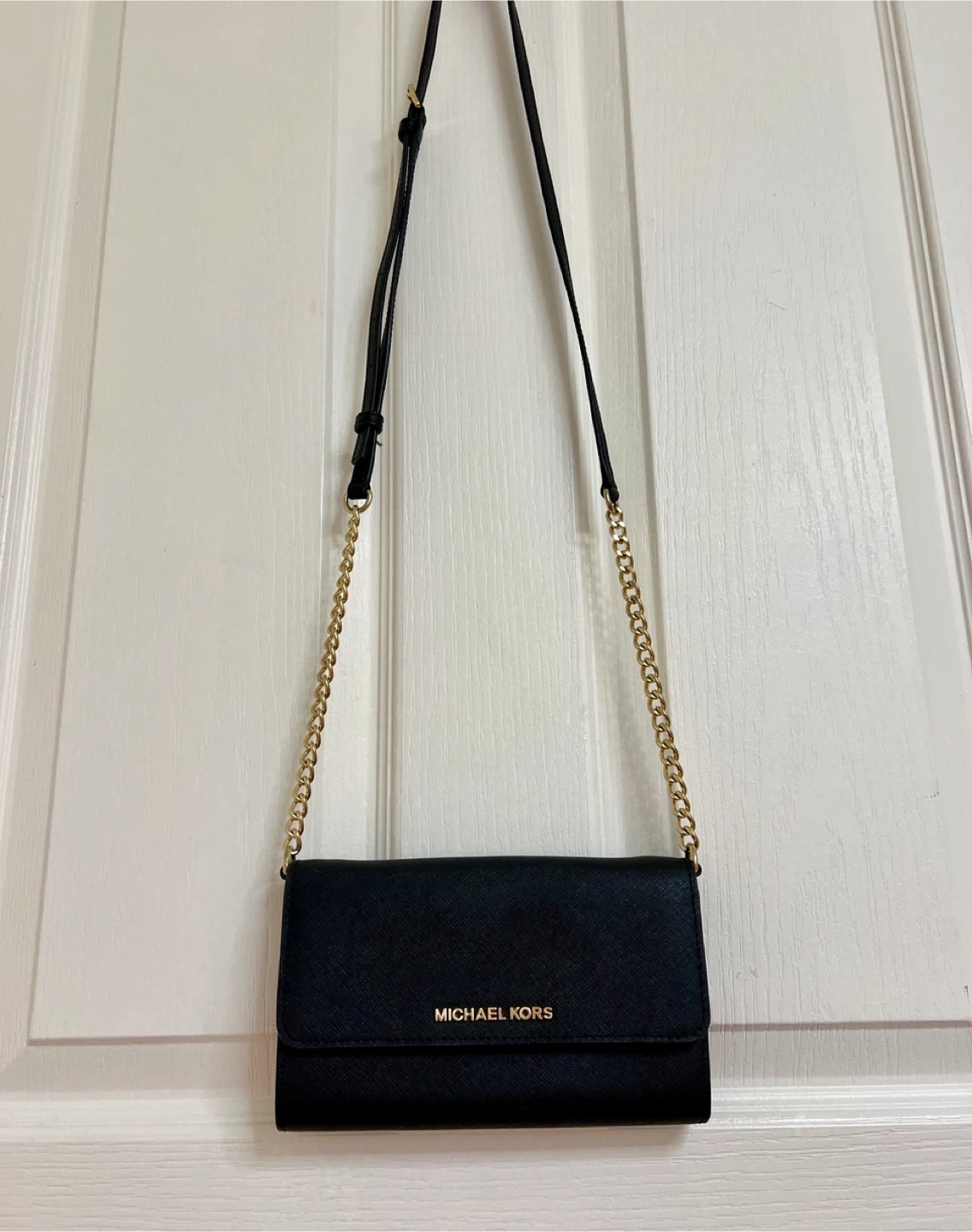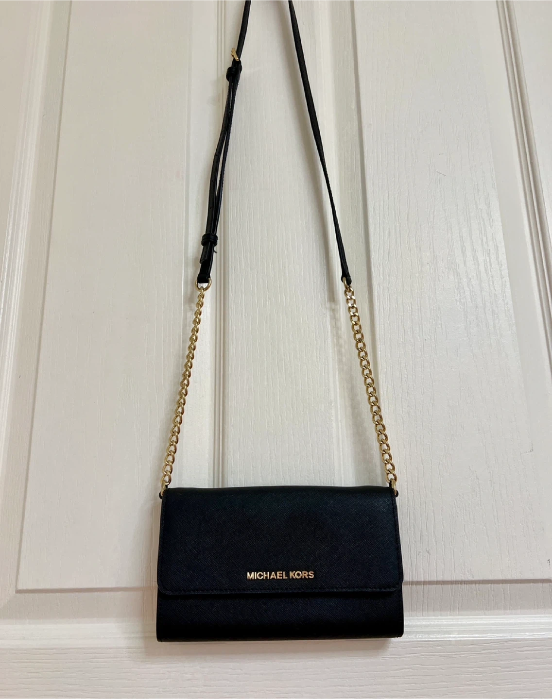 Selling a superb Michael Kors crossbody leather bag in black! It has an adjustable strap and your cell phone will fit perfectly inside. Two separators to keep things organized. Six credit card slots. A hidden zipper for valuables. Perfect for a night out or everyday use!