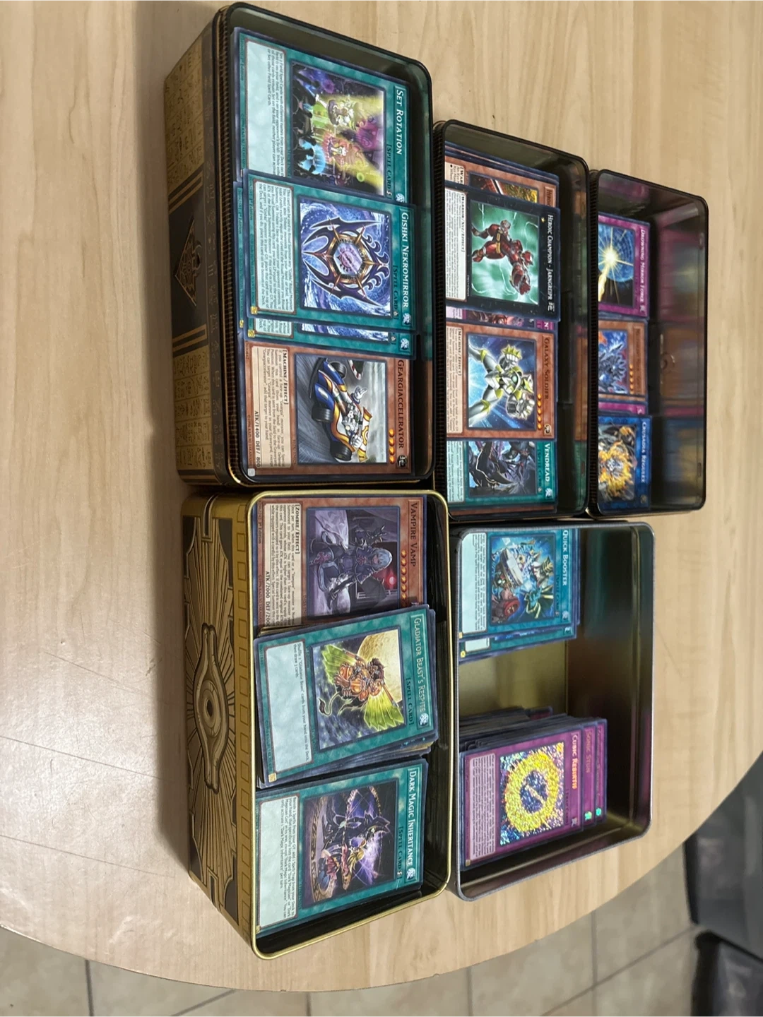 60Selling a collection of Yu-Gi-Oh! cards stored in a decorative tin. The collection includes various cards, such as Set Rotation, Gishki Nekromirror, Geargiaccelerator, Heroic Champion - Jarngreipr, Galaxy Soldier, Vendread, Vampire Vamp, Gladiator Beast's Respite, Dark Magic Inheritance, Quick Booster, Sonic Stun, and Cubic Rebirth. Great for collectors or players!