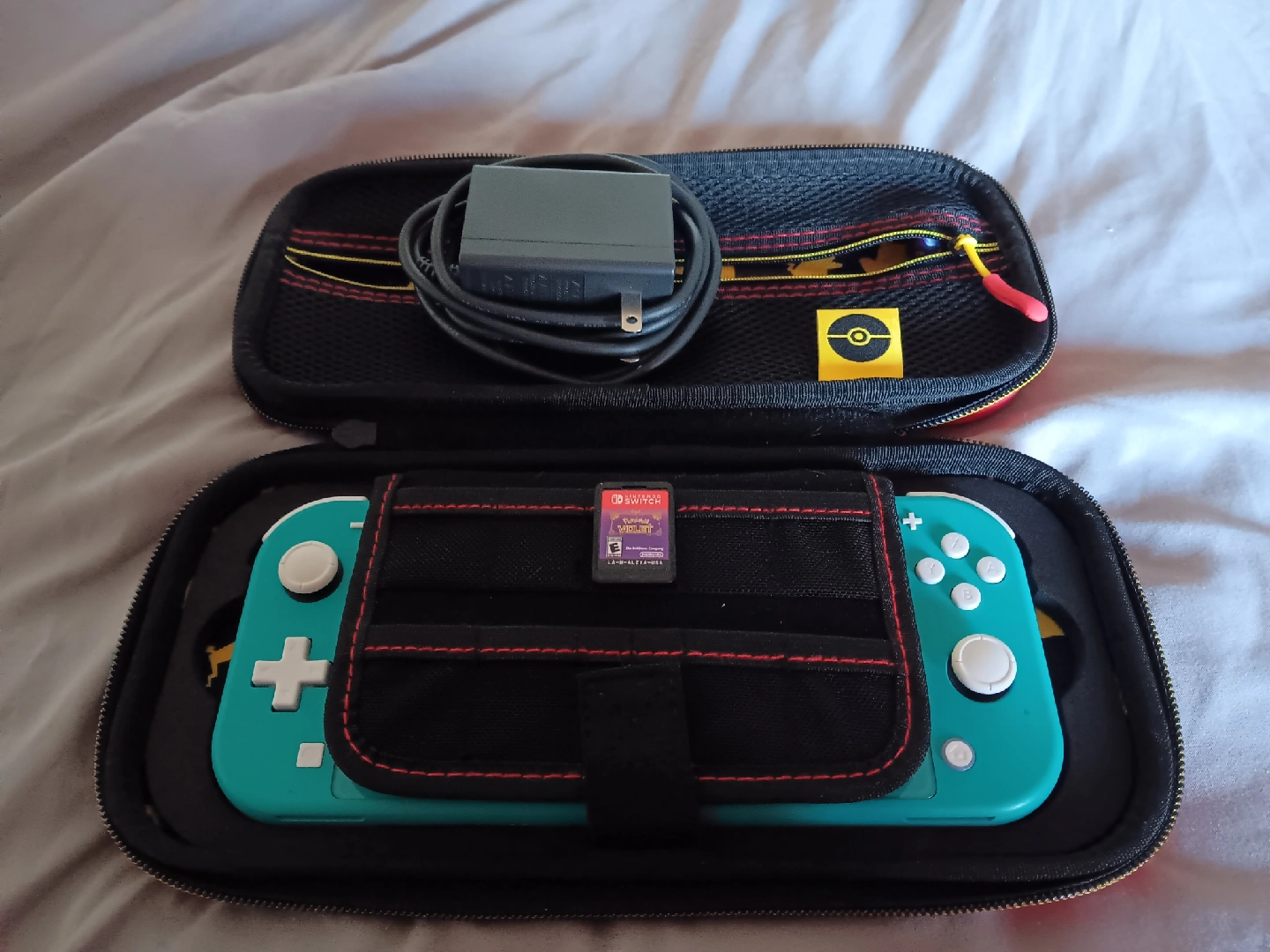 Selling a Nintendo Switch Lite in turquoise! Comes with a carrying case, charger, the game Pokemon Violet, and a 256GB SanDisk Micro SD card for extra storage. Everything you need for gaming on the go!