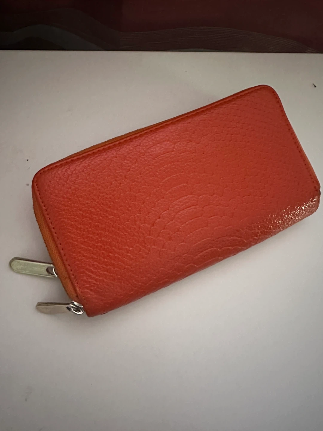 1000+Selling an orange zip-around wallet. It has a textured exterior and a zip closure. Inside, there are multiple compartments for cards and cash. Perfect for keeping your essentials organized! Pay by cash please