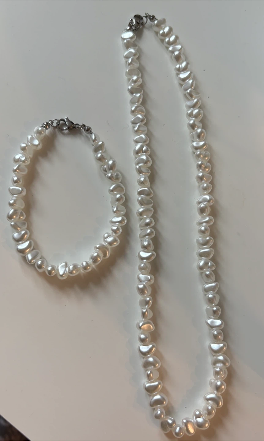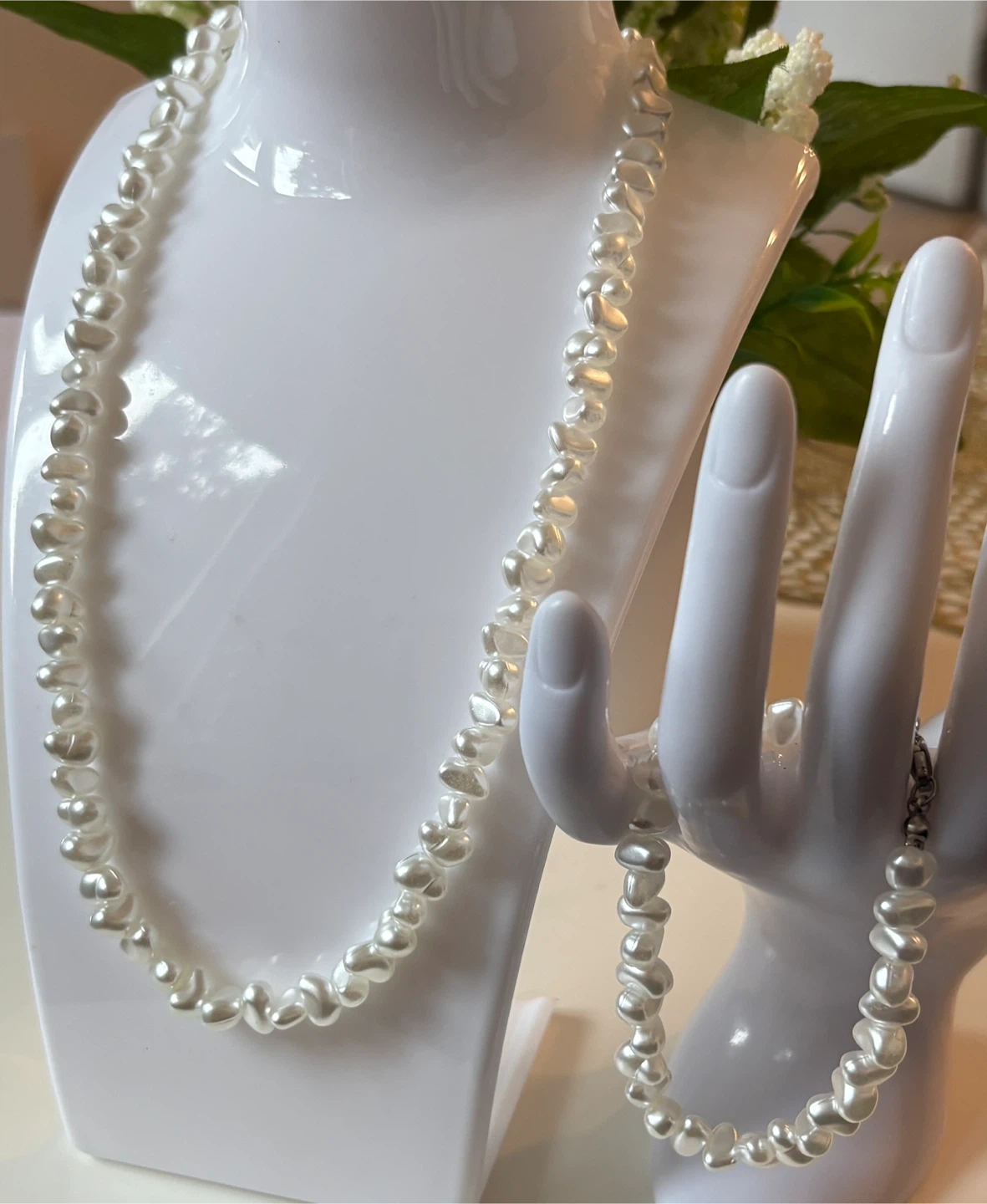 A beautiful white faux pearl beaded necklace and bracelet set! This set is brand new and comes a decorative box, perfect for gifting. The pearls have a lovely shimmer and the set is very elegant.