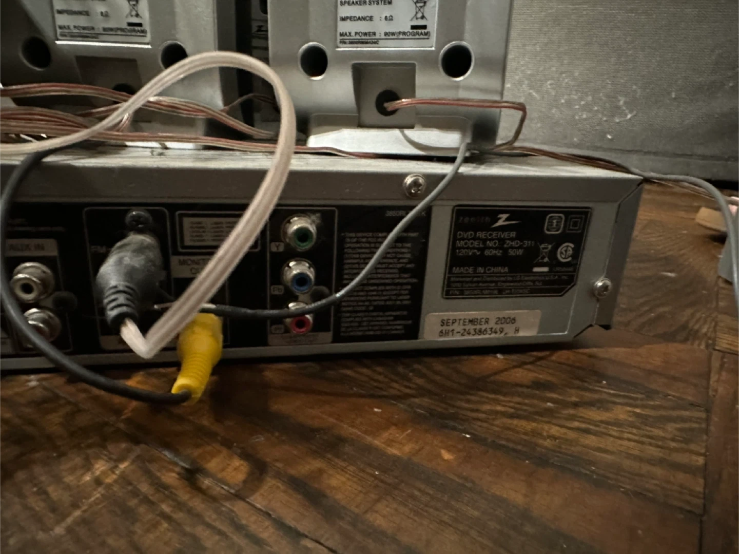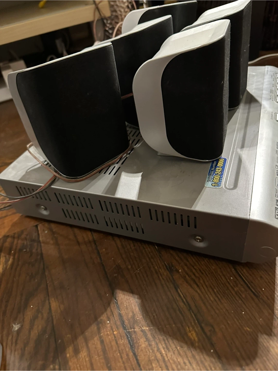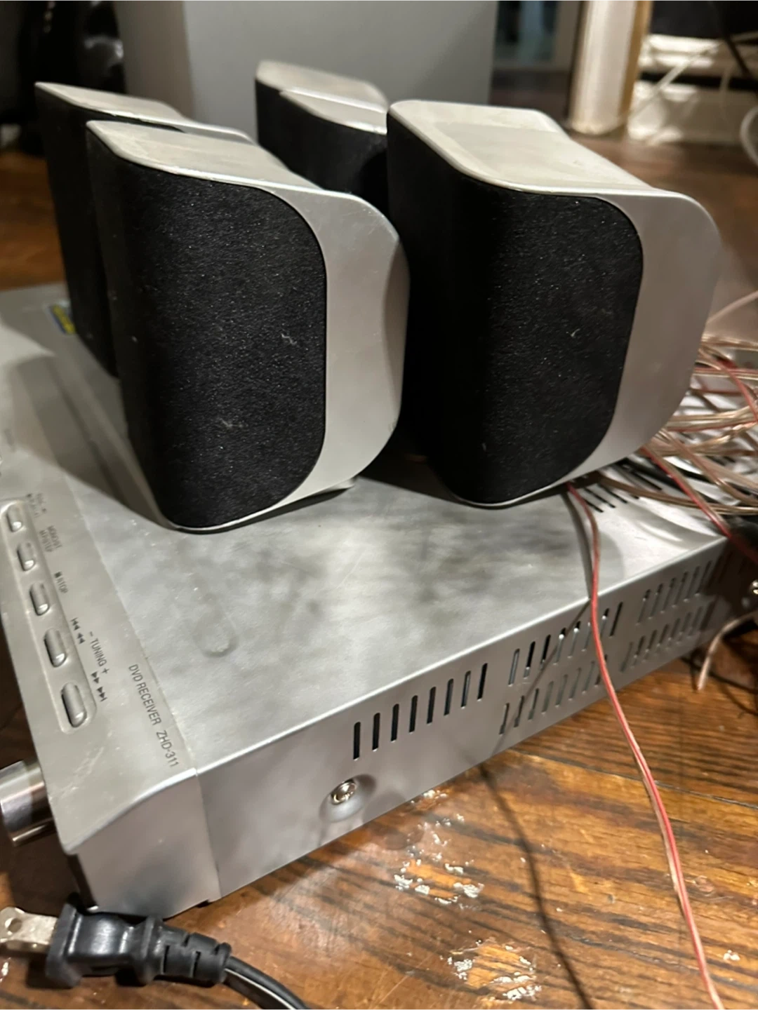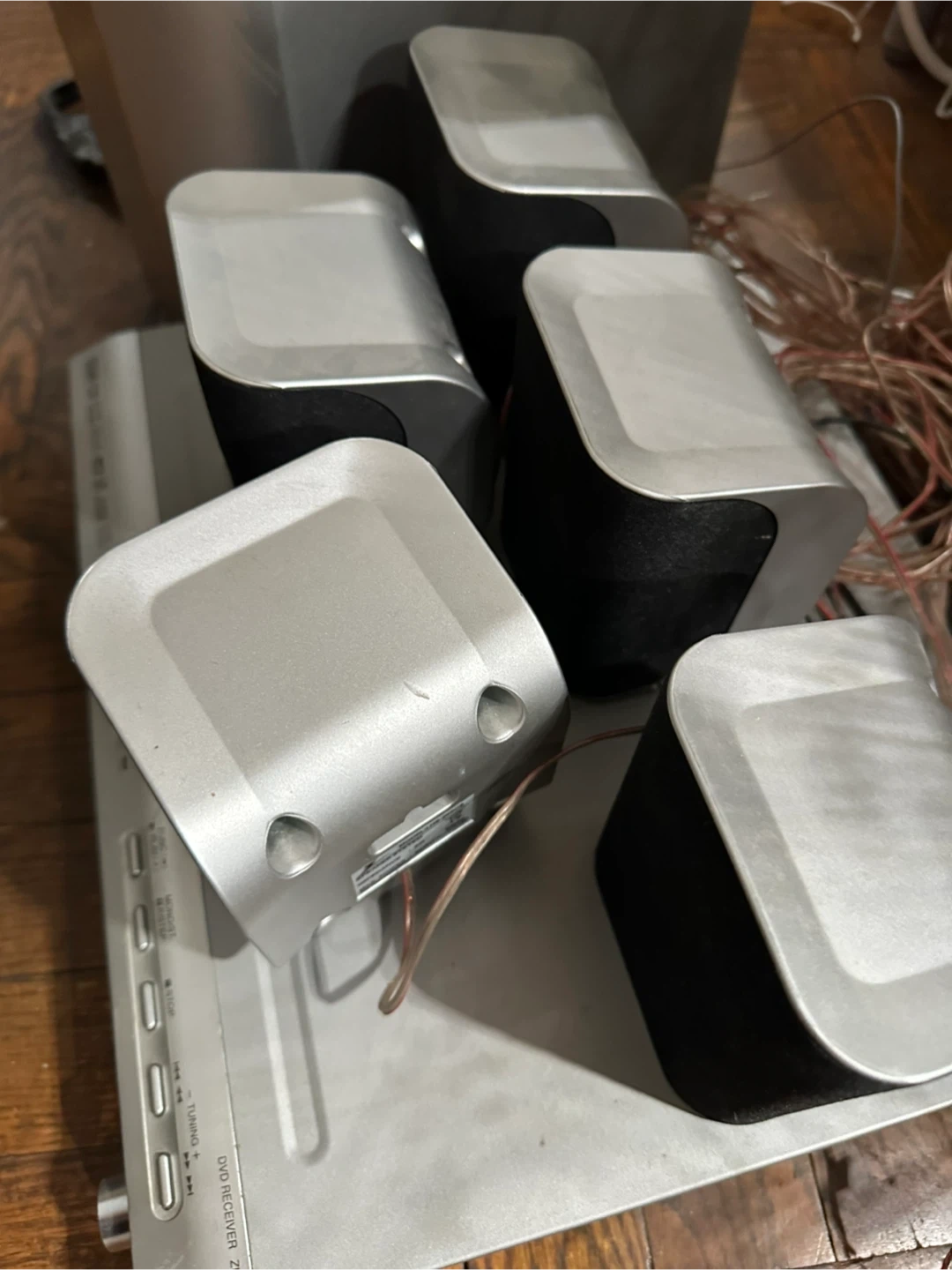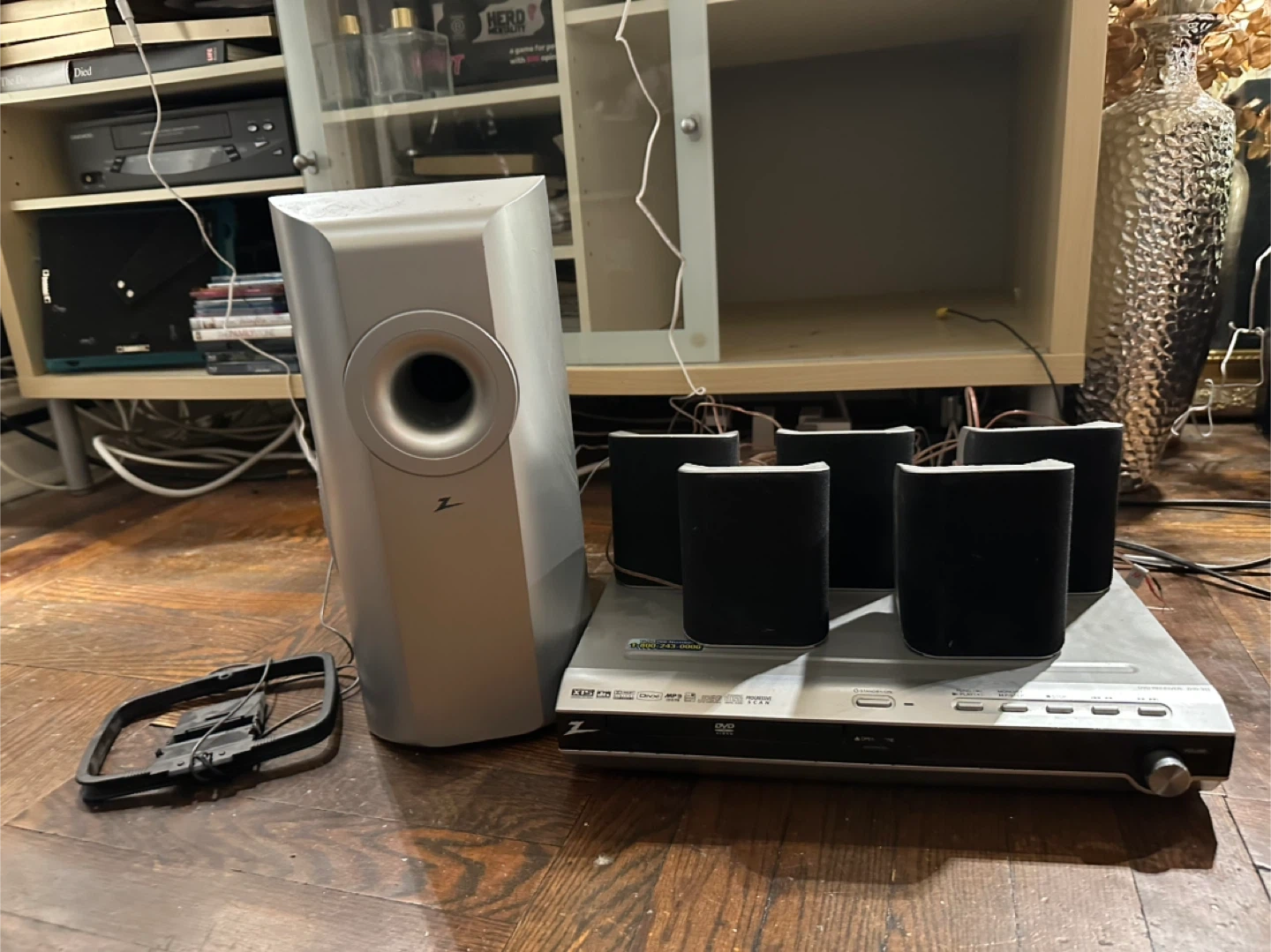 Selling a Zenith DVD receiver along with a set of 5 speakers and a subwoofer. All speakers are connected which saves time for the buyer.It's a complete home theater audio setup. Perfect for enjoying movies and music with immersive sound!